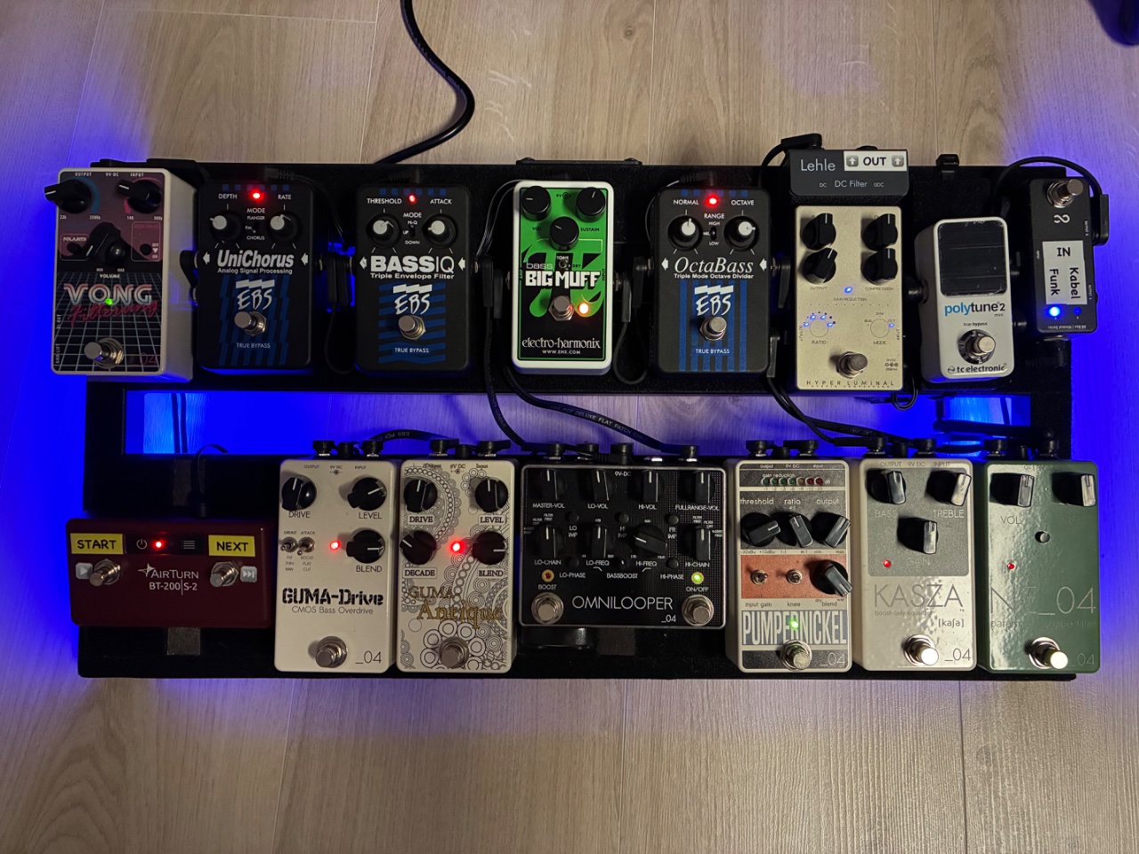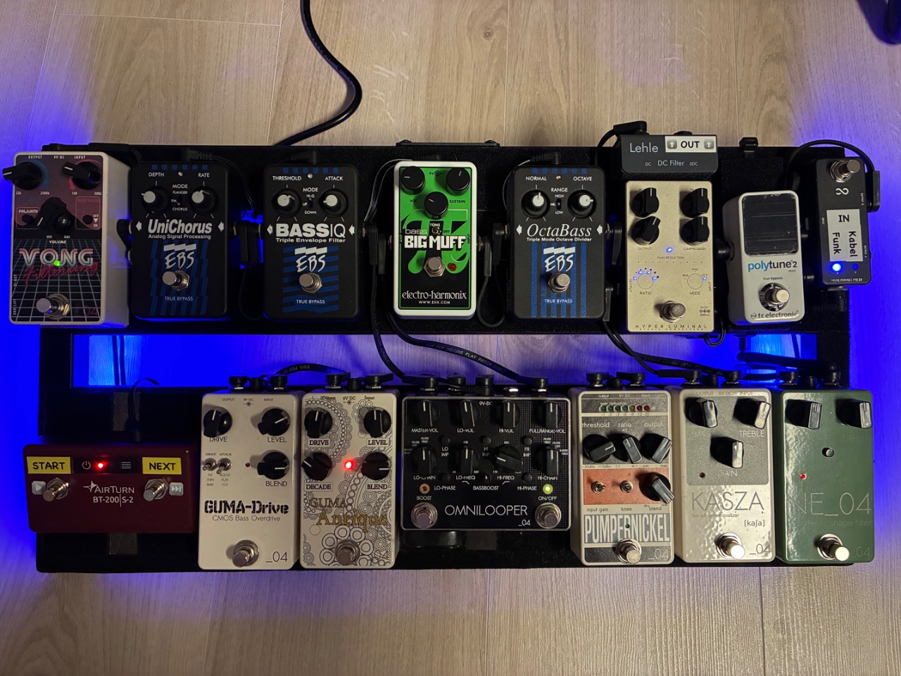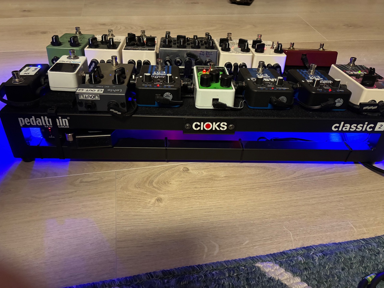 Das Board wurde auf einem Pedaltrain Classic 2 aufgebaut und nur mit EBS Flat Patch Pro Kabeln verkabelt.