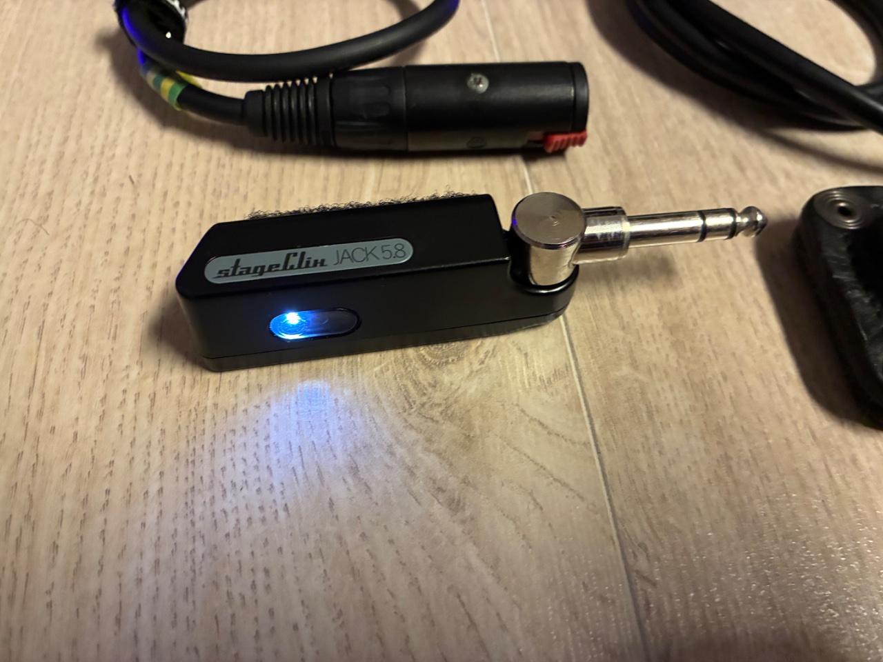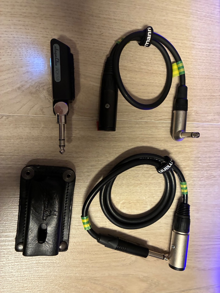 - StageClix Jack 5,8 Funkstrecke (hinten unten im Board montiert - Sender lädt direkt im Empfänger inkl 2x Extension-Kabel und original Sendertasche aus Leder)