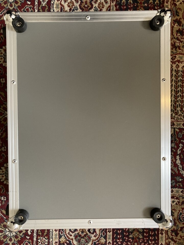 Das Board wurde Ende letzten Jahres neu gekauft und sehr pfleglich behandelt. Deswegen ist der Zustand auch sehr gut, einzig auf der Rückseite sind zwei Stellen sichtbar, an denen ich das Netzteil befestigt hatte. Auch das Case ist in einwandfreiem Zustand, die Sticker kann man natürlich entfernen. Auf dem Board ist aktuell Klett zur Befestigung der Pedals angebracht, auch dieser ließe sich selbstverständlich entfernen.