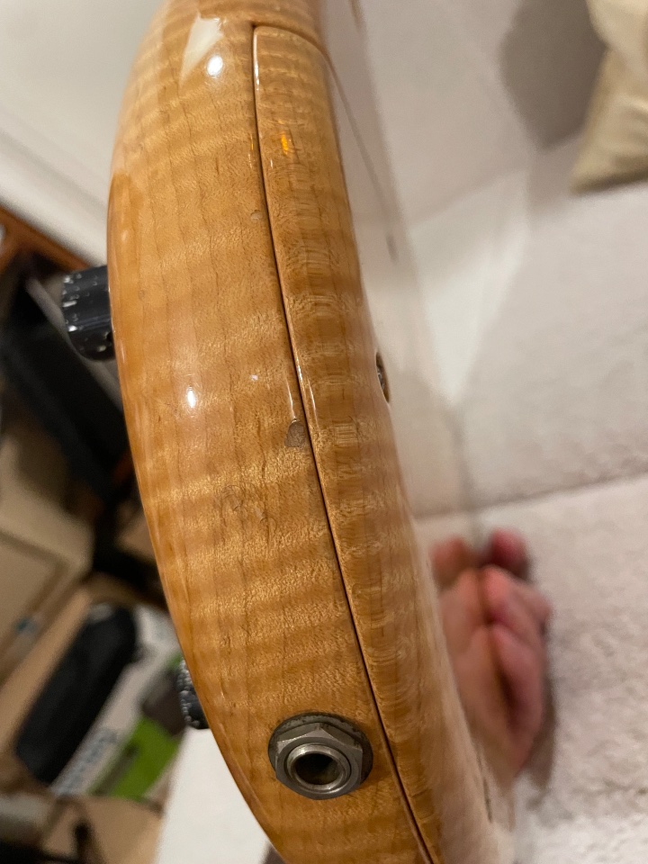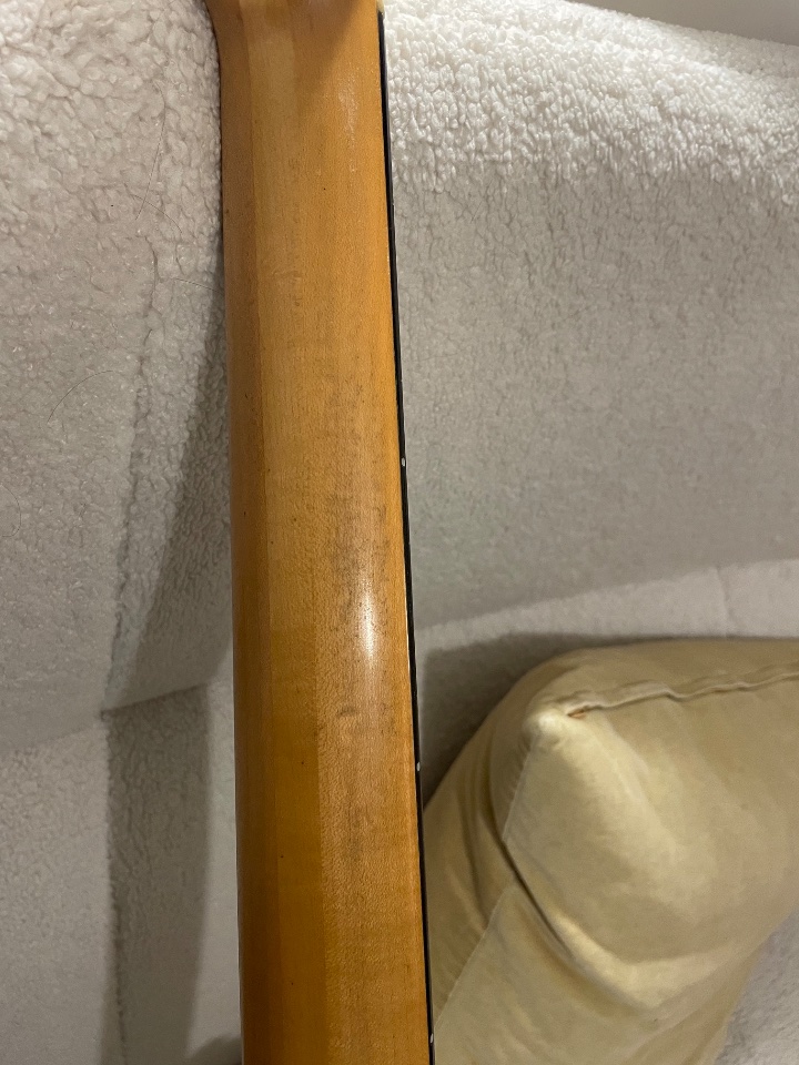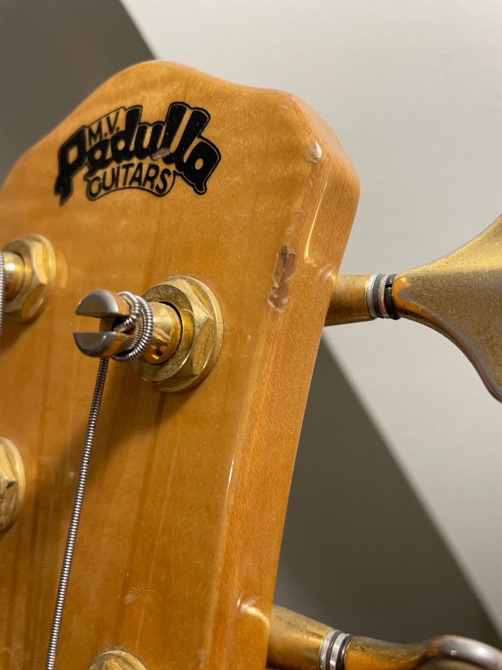 Für ein knapp 30 Jahre altes Instrument, das viel gespielt wurde, steht er gut da. Allerdings ist zu erkennen, dass der Bass auch auf Bühnen durfte und kein trauriges Dasein in einer Vitrine erleiden musste. An der Kopfplatte sowie am Korpus sind ein paar Stellen zu erkennen. Außerdem sieht man bei genauer Betrachtung, dass die filigrane Lackierung von Michael Pedulla an den Griffbrettkanten etwas “ge-aged” ist.