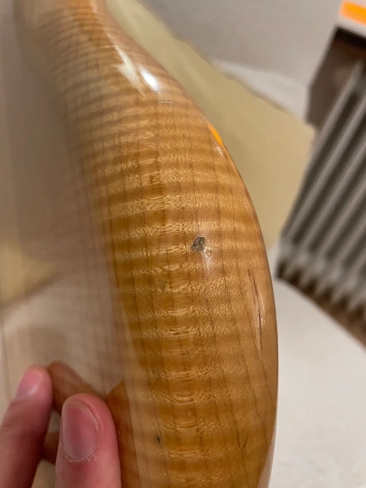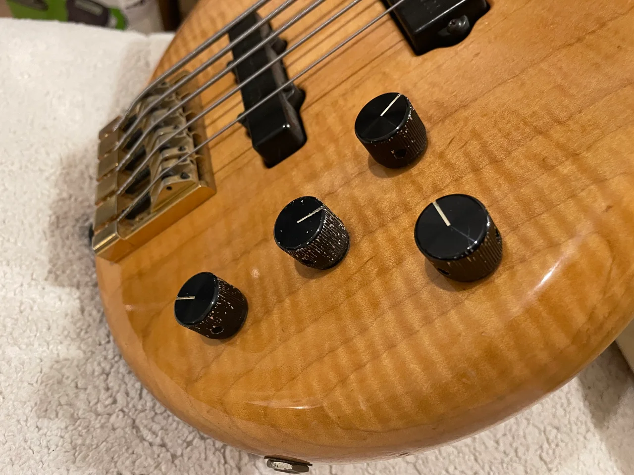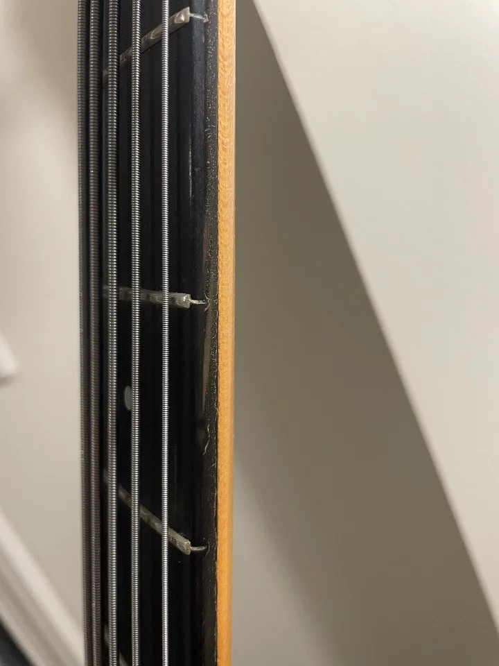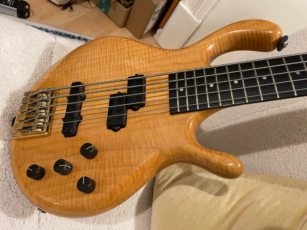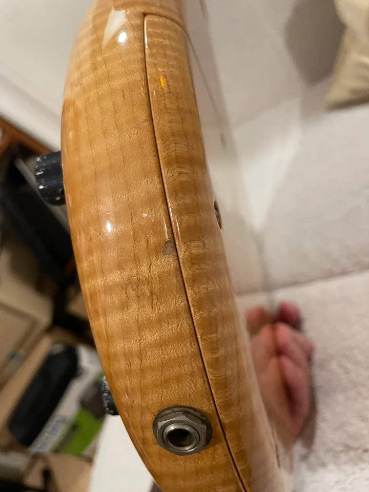 Für ein knapp 30 Jahre altes Instrument, das viel gespielt wurde, steht er gut da. Allerdings ist zu erkennen, dass der Bass auch auf Bühnen durfte und kein trauriges Dasein in einer Vitrine erleiden musste. An der Kopfplatte sowie am Korpus sind ein paar Stellen zu erkennen. Außerdem sieht man bei genauer Betrachtung, dass die filigrane Lackierung von Michael Pedulla an den Griffbrettkanten etwas “ge-aged” ist.
