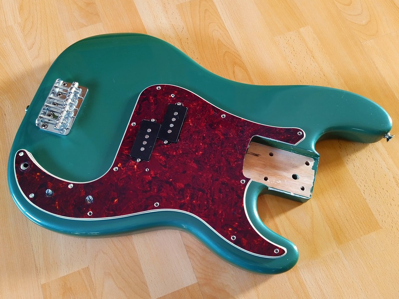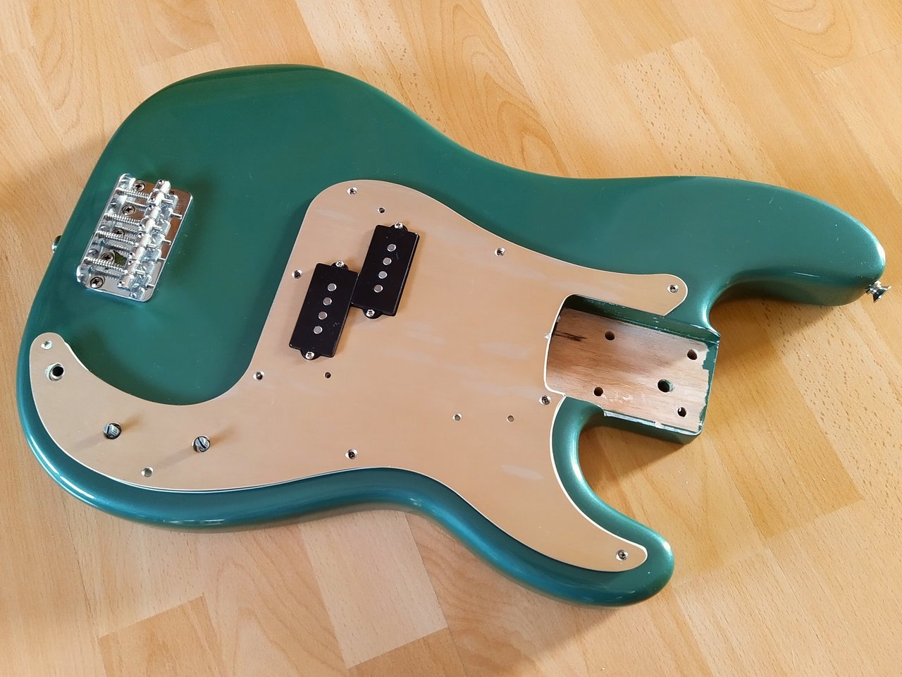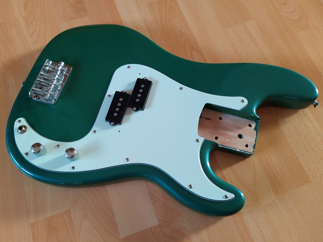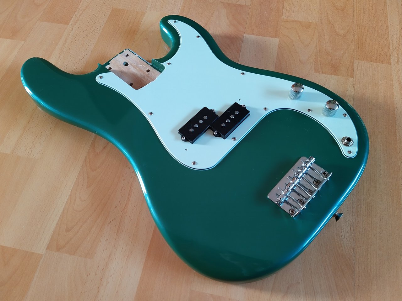 Verbaut sind Pickups und Brücke von einem Squier VM Precision Bass. Dazu ist ein neues 3-lagiges Mint-Pickguard montiert. Ich könnte das bei Bedarf aber auch gegen tortoise, schwarz oder gold anodized austauschen, Bilder sind mit dabei.