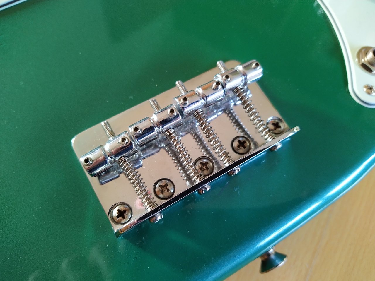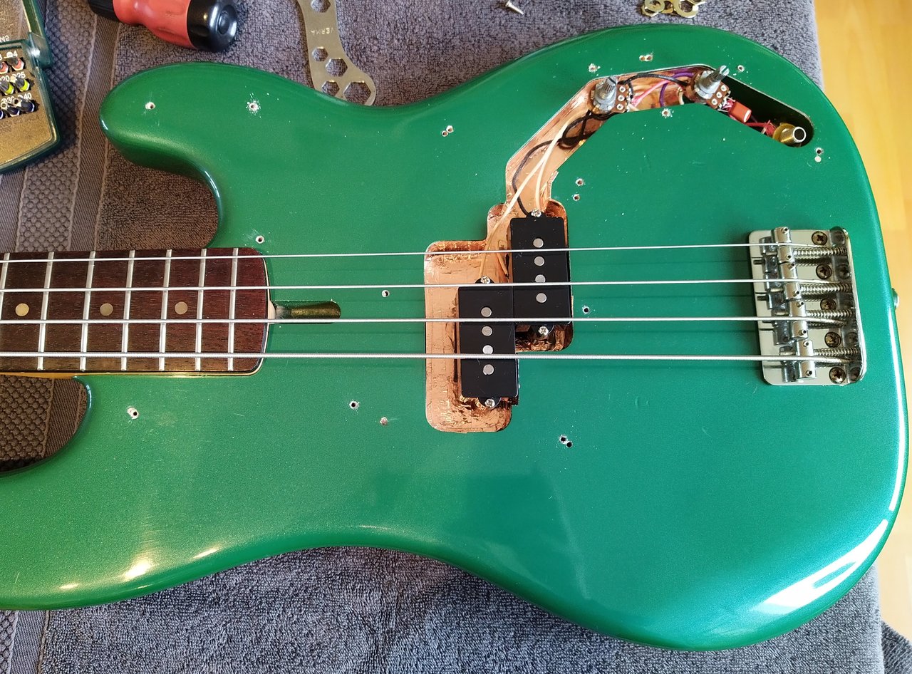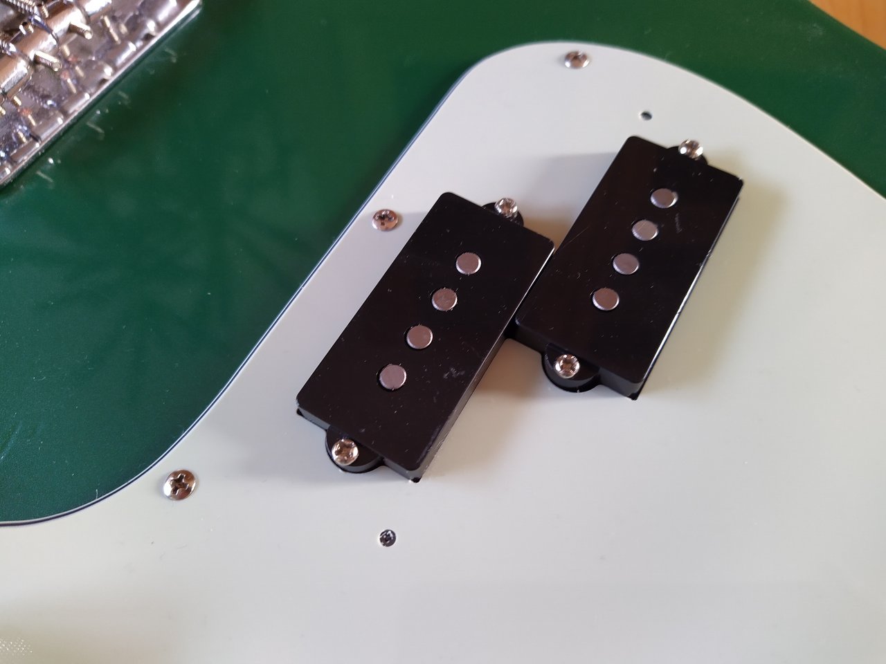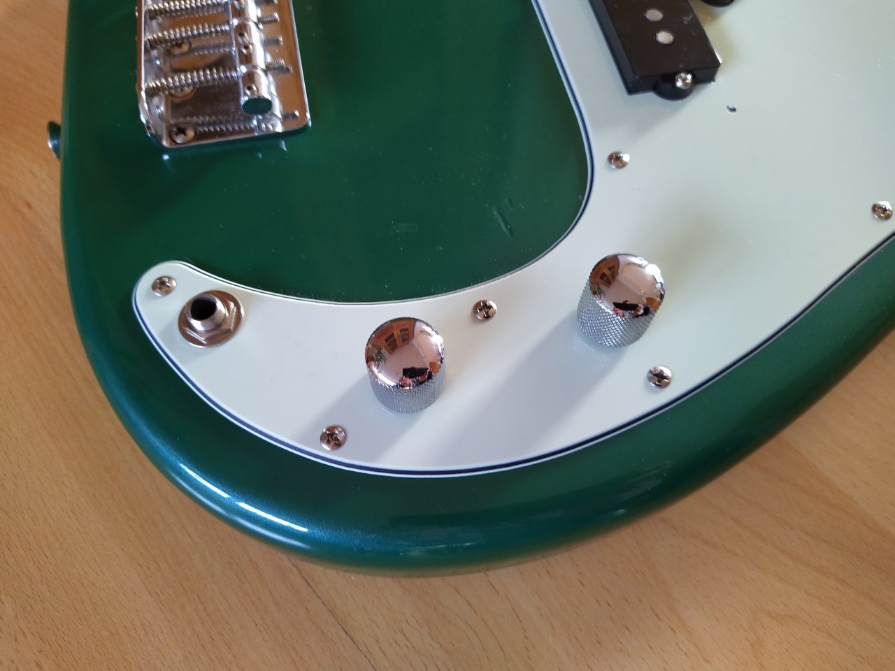 Verbaut sind Pickups und Brücke von einem Squier VM Precision Bass. Dazu ist ein neues 3-lagiges Mint-Pickguard montiert. Ich könnte das bei Bedarf aber auch gegen tortoise, schwarz oder gold anodized austauschen, Bilder sind mit dabei.