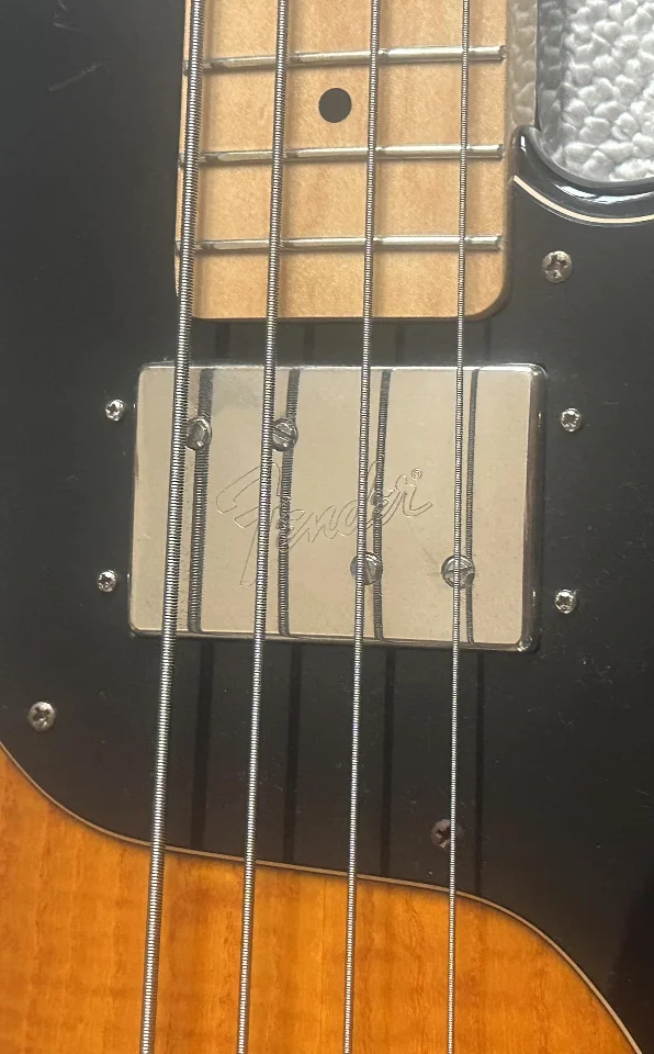 Eingebaut ist ein Fender Humbucker Pickup (wie beim '72er) in der Halsposition, die Polschrauben kann man einzeln in der Höhe verstellen. Der Ausgangspegel von diesem Pickup ist sehr hoch, er klingt satt und fett und hat viel Wumms.