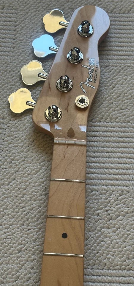 Der Fender 1951 Precision Bass Neck ist ein einteiliger Ahorn-Hals mit Kopfplatte im Telecaster-Stil: Scale Length 34" (864 mm), Halsbreite 1.625" (41.3 mm), kräftiges `51er U-Halsprofil [1st Fret - .940” (23.88 mm), 12th Fret - .990” (25.15 mm), 9.5" Griffbrettradius (241 mm)] und 20 Bünden im Medium-Jumbo-Format. Fender Datumsaufdruck ist der 06. Mai 2022.