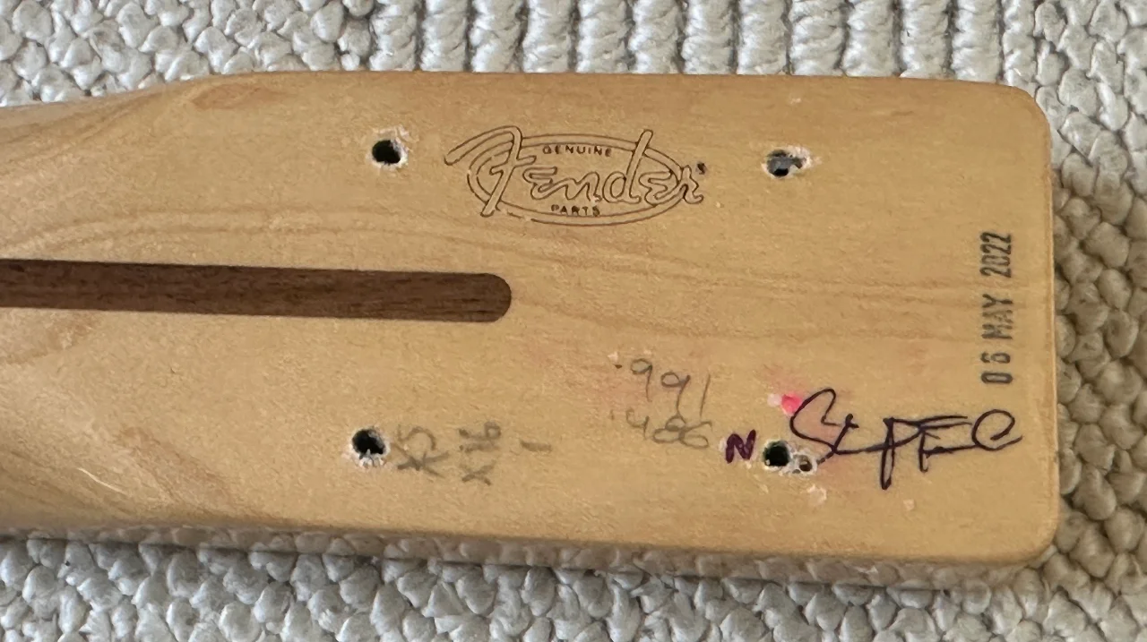 Es sind die leichten Fender Deluxe Chrome Mechaniken verbaut, diese waren von Anfang an eingesetzt, es sind also keine weiteren Schraubenlöcher von anderen Mechaniken in der Kopfplatte. An den Bünden ist kein Verschleiß und es sind nur minimale Spielspuren zu sehen, der Halsspannstab lässt sich leicht drehen, der Hals in einem sehr guten Zustand.