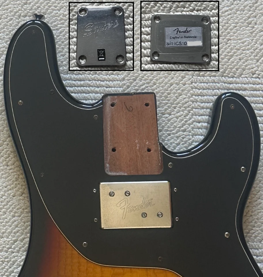 Er hat eine vintage string-through-body Brücke, bei der jeweils zwei Saiten auf einem Saitenreiter liegen, das Messing ist schon etwas angelaufen. Die Regler für Master Volume und Master Tone sind die geriffelten Fender Chrome Dome Knobs. Der Hals ist mit einer neutralen Halsplatte befestigt, die originale Platte (Squier) ist mit dabei, ein Bild der originalen Seriennummer ist da aufgeklebt.
