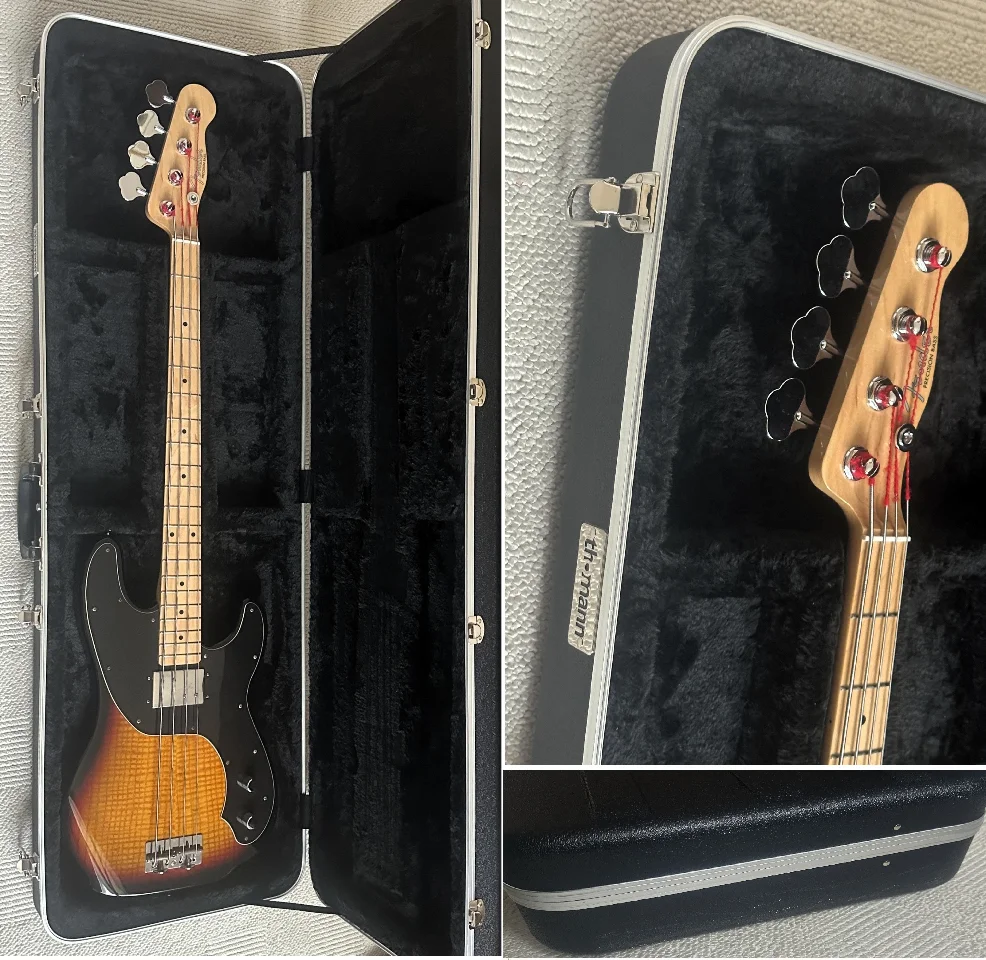 Auf dem Pickguard sind einige Gebrauchsspuren zu sehen, der Body hat aber keine auffälligen Lackschäden oder Abplatzer und nur zwei leichte Kratzer am Korpus bei der Unterseite der Halstasche und auf der Rückseite bei der Klinkenbuche (siehe Fotos). Laut Personenwaage wiegt der Bass komplett ca. 4,3 kg.