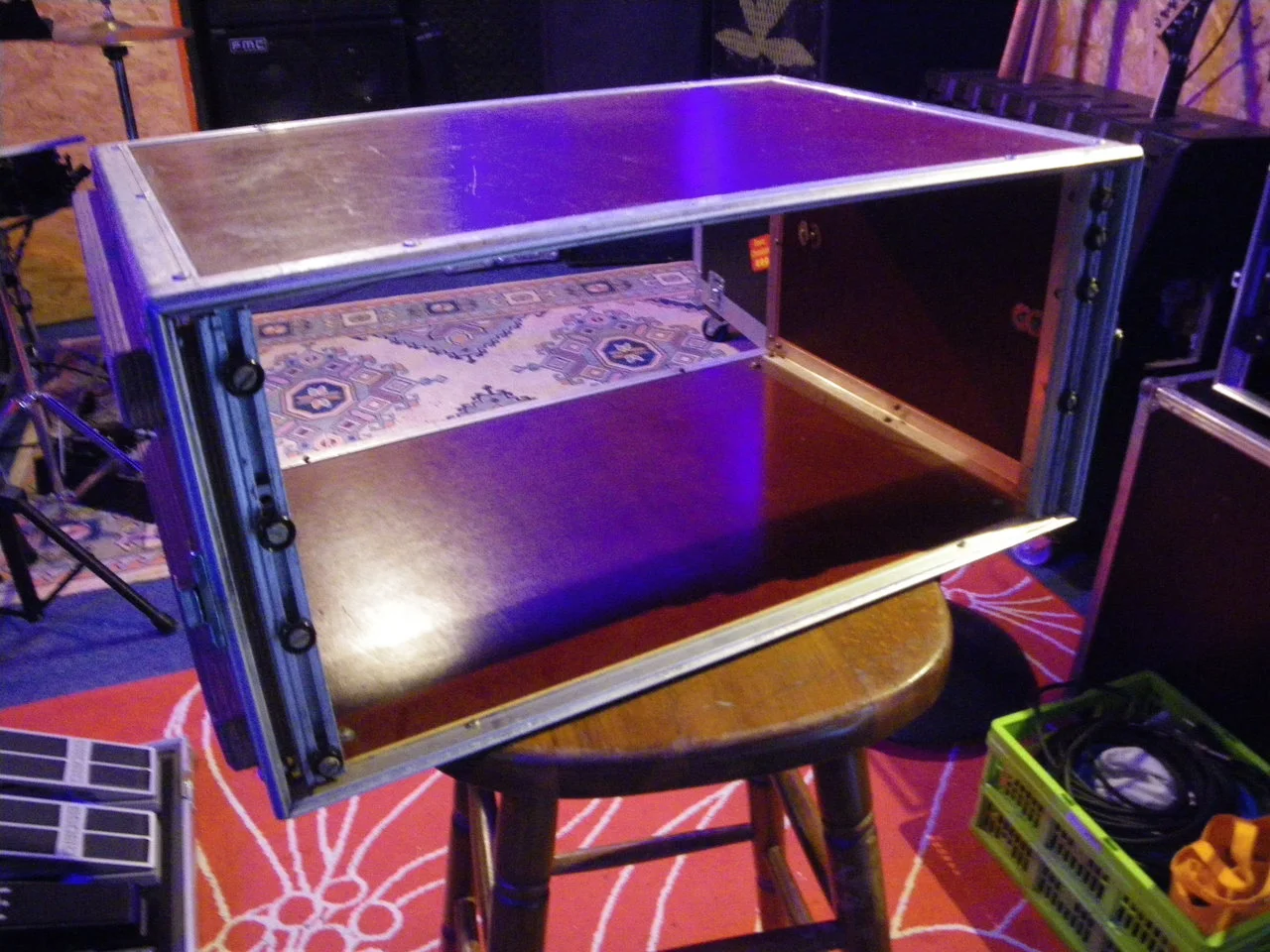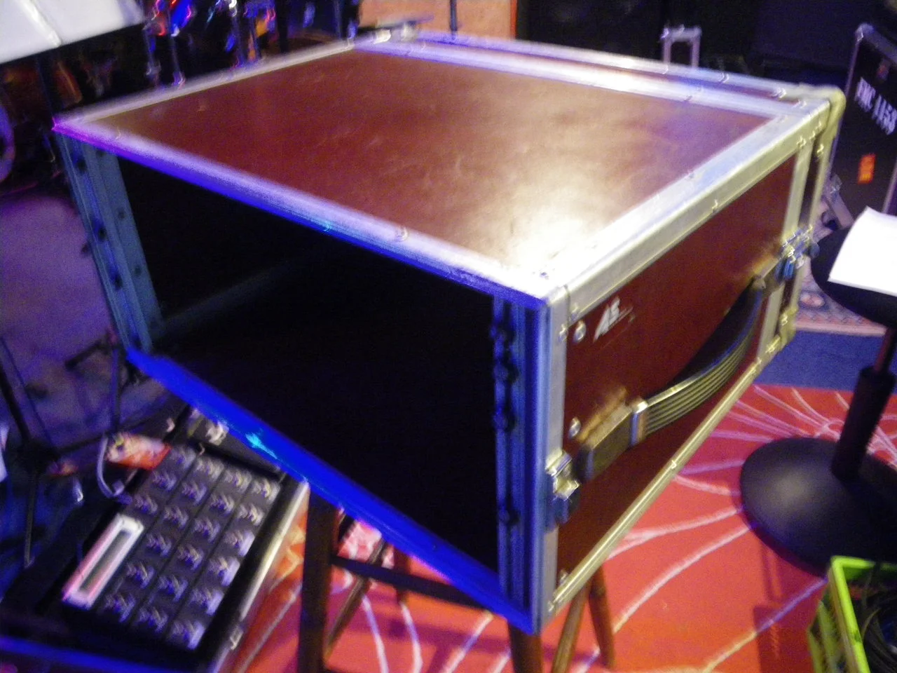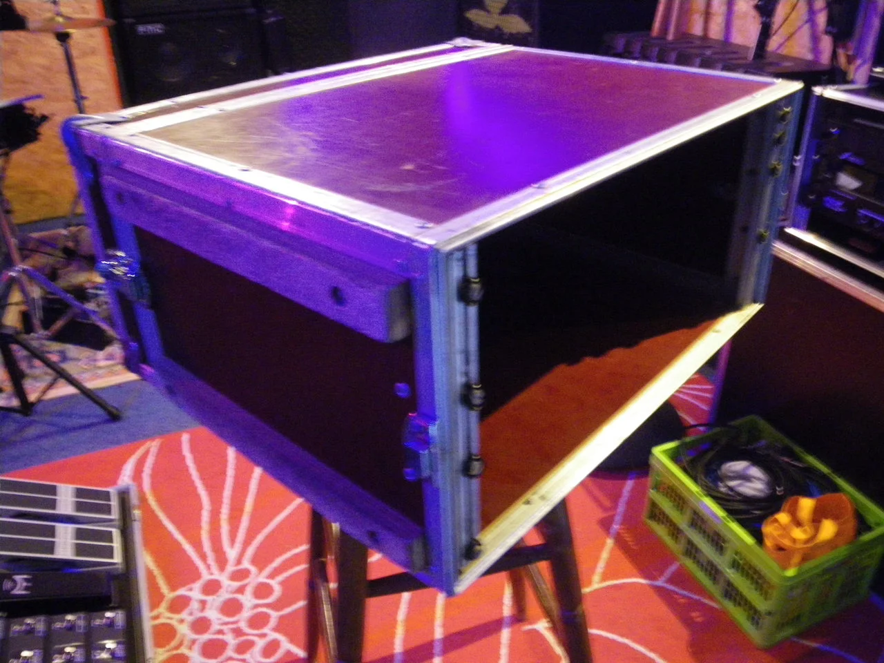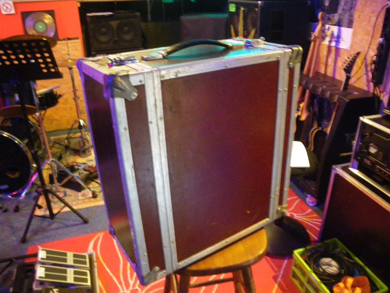 älteres Case vom Acoustic Service Hannover. Voll funktionstüchtig und in Ordnung. Doubledoor mit Rackschienen vorn. Setlicher Tragegriff, Holzschienen zum sicheren Abstellen an der gegenüberliegenden Seite. Unten 4 Gummifüße für den sicheren Aufbau.