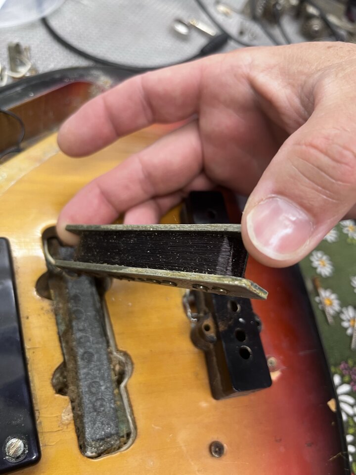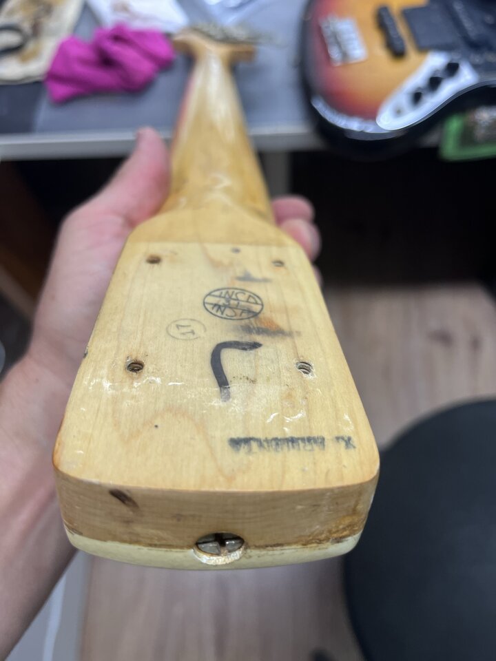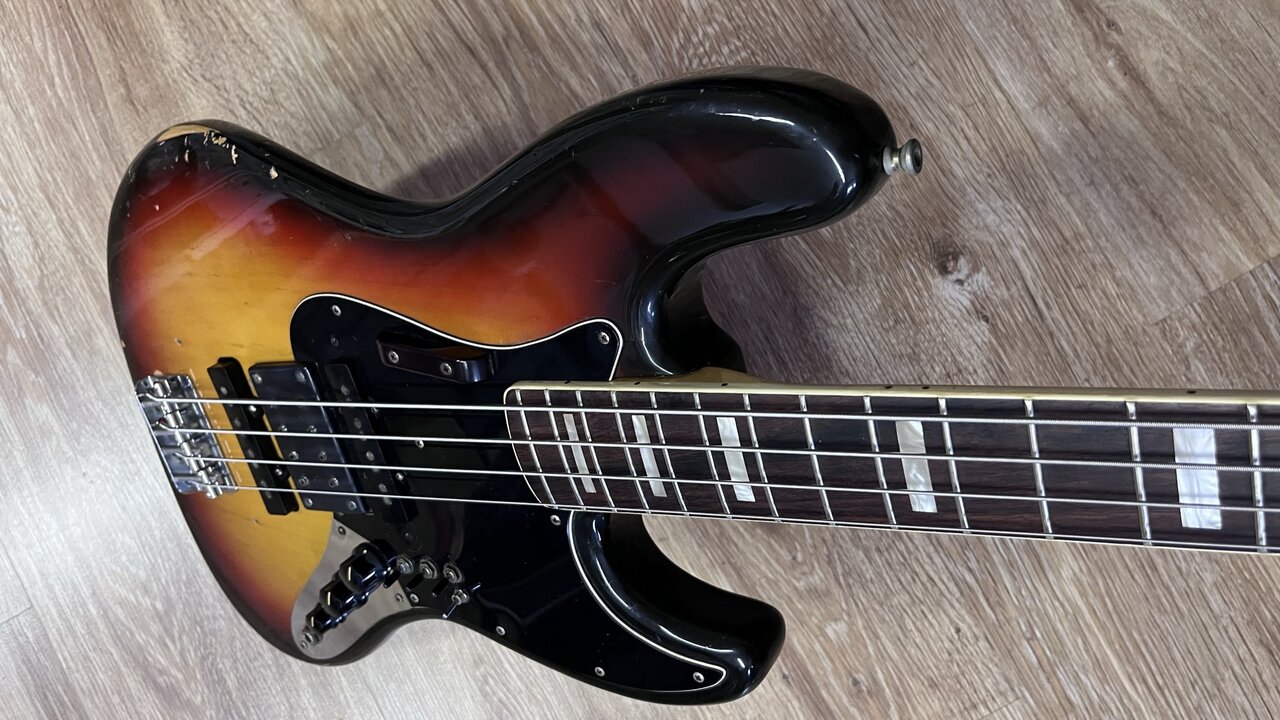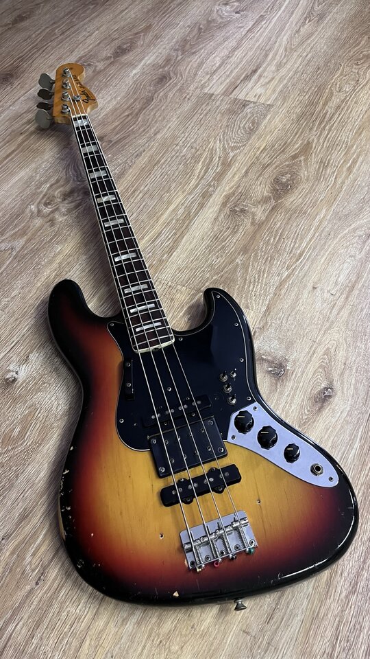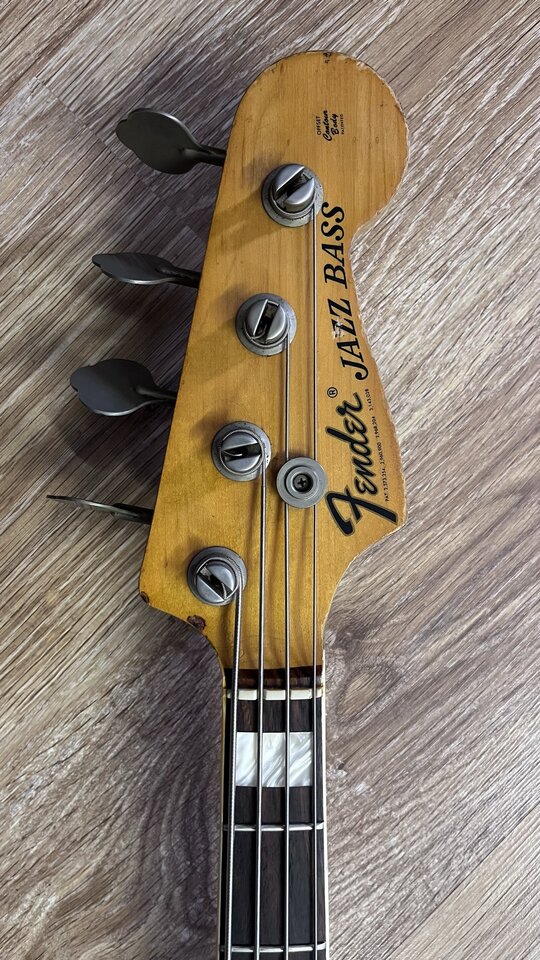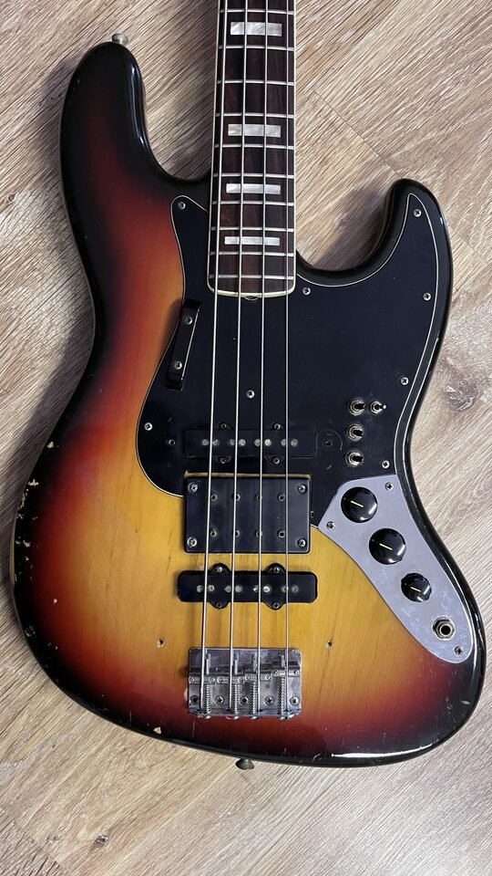 Der DiMarzio liefert einen warmen, vollen Ton, keinen mud. Für einen aufgehellten und saubereren Sound kann man mit dem zusätzlichen Mini-Schalter von Serie auf Parallel schalten: die Lautstärke sinkt minimal, aber die Mitten öffnen sich und bekommen eine akustischere Qualität. Dieser Bass ist ein sehr guter Player mit einem kräftigen Hals - beste Bespielbarkeit mit einem gut funktionierenden Halsstab und ohne Schnarren in den höheren Bünden. Dieser hat bereits das schwarze Pickguard (das natürlich original ist), hat aber noch eine 4-Schrauben-Befestigung des Halses. Die Potis sind auf Ende 1973 datiert, die Tonabnehmer beide auf 1974. Ich habe eine Menge Bilder, in denen ich gerne jedes Detail zeigen kann, um ev. Fragen zu beantworten.