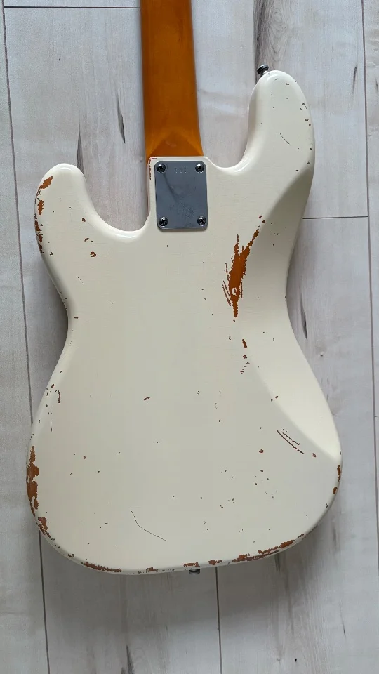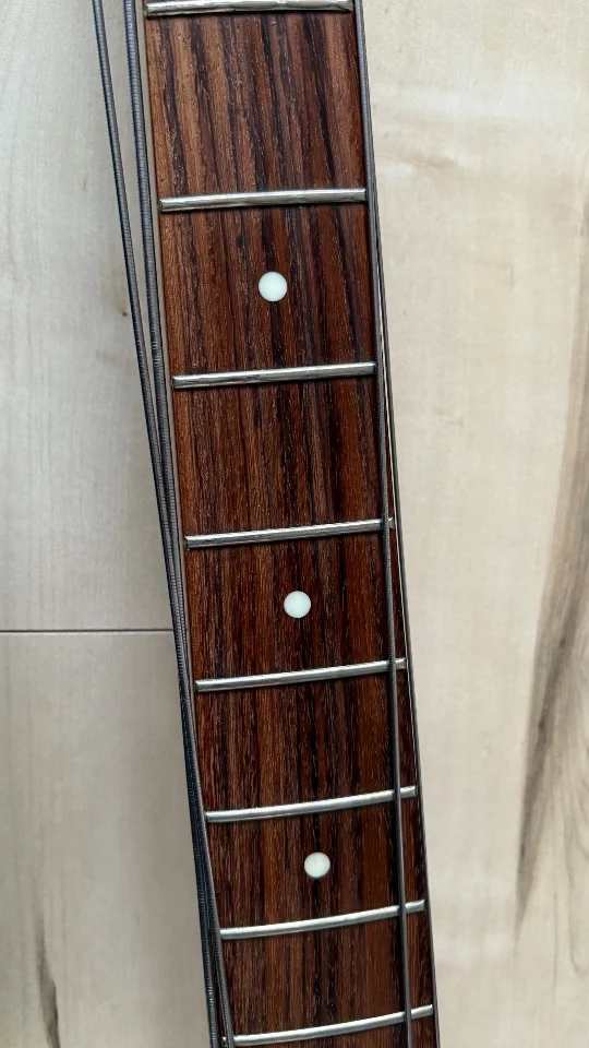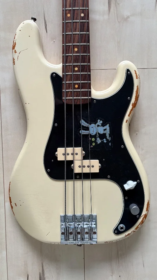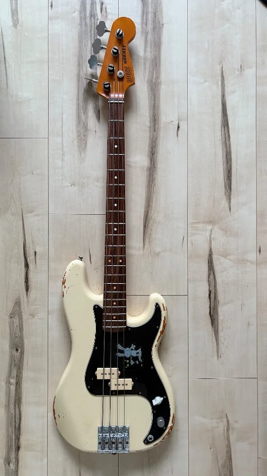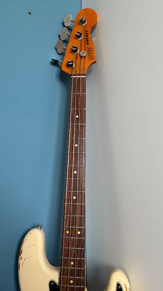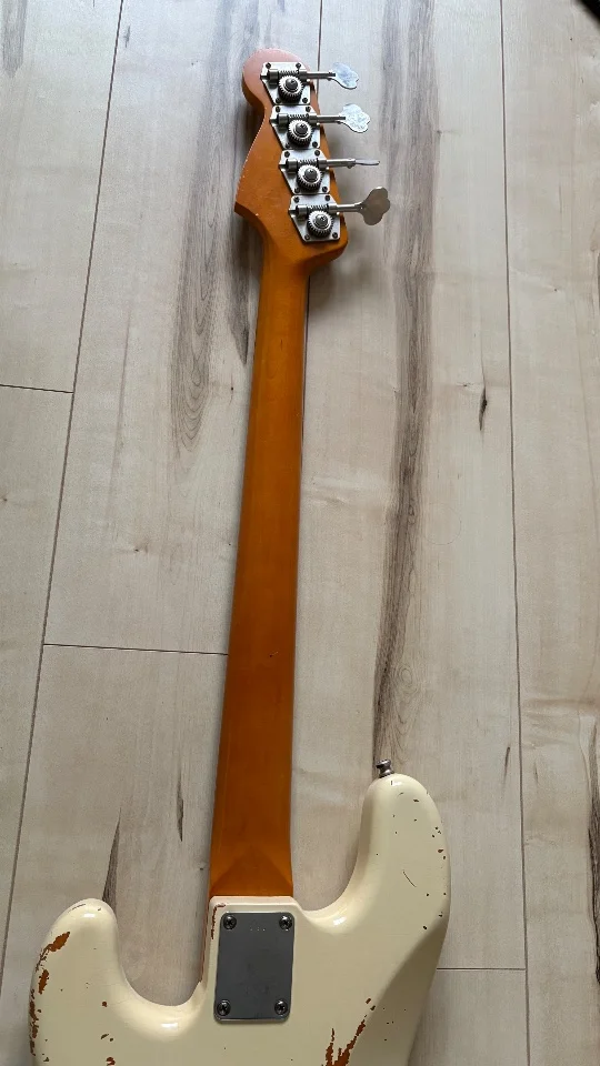 Der Bass ist technisch einwandfrei, minimalste spielspuren (keine Abnutzung) auf den Bünden. Das Aging ist sehr gelungen, er hat schöne Crackles im Lack.