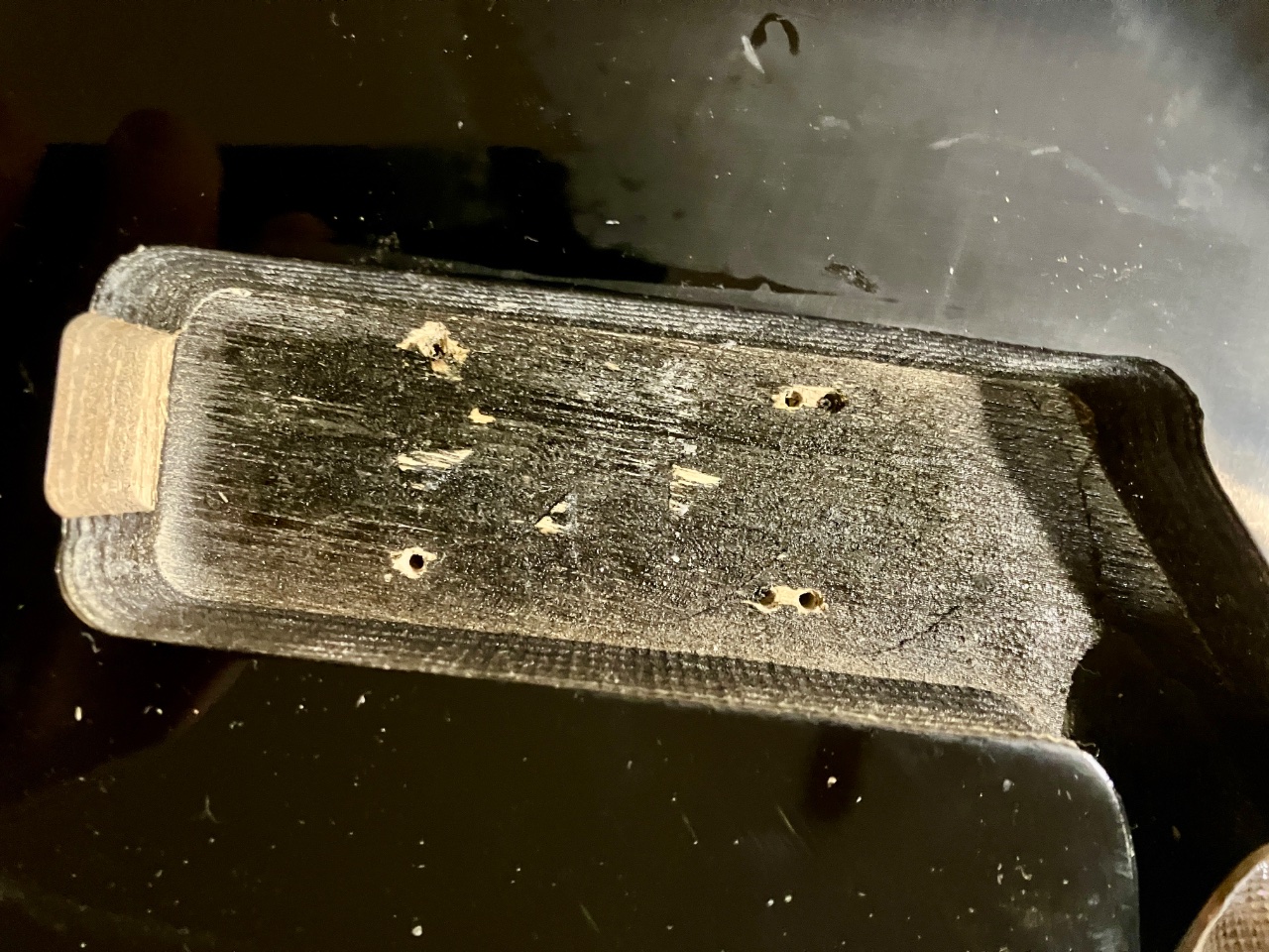 Die originalen Pickups hat der Vorbesitzer entsorgt. Waren wohl zwei Neck-Pickups im Original. Für den Bridge-Pickup wurde die Oberfräse angeworfen. Fällt schwarz in schwarz nicht sofort auf.