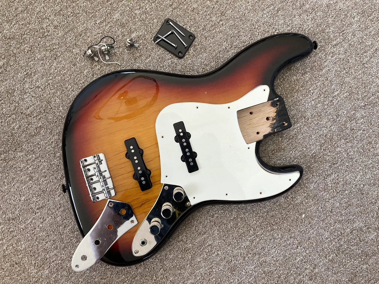 ich biete den Korpus eines alten Harley Benton JB20 (der hatte noch die F Style Kopfplatte), wahlweise blank oder mit Hardware. Hier entweder nur die originale verchromte (soweit noch vorhanden; bei der Bridge fehlen einem Saitenreiter die Madenschrauben; keine Potiknobs mehr vorhanden) oder zusätzlich die vernickelte (oder schwarze), welche ich nachgerüstet habe (generell habe ich leider nicht mehr die Bridgebefestigungsschrauben; bei der Wilkinson waren trotz Neukaufs keine bei). Danach richtet sich dann auch der Preis.