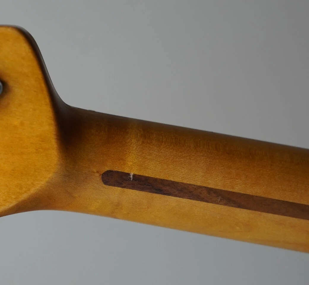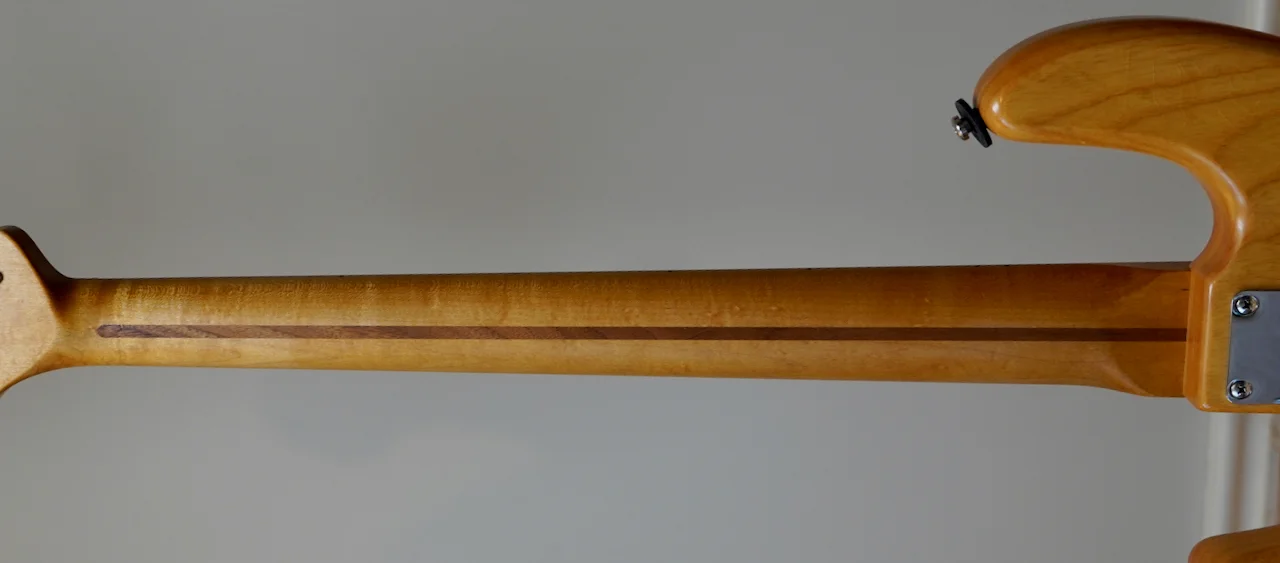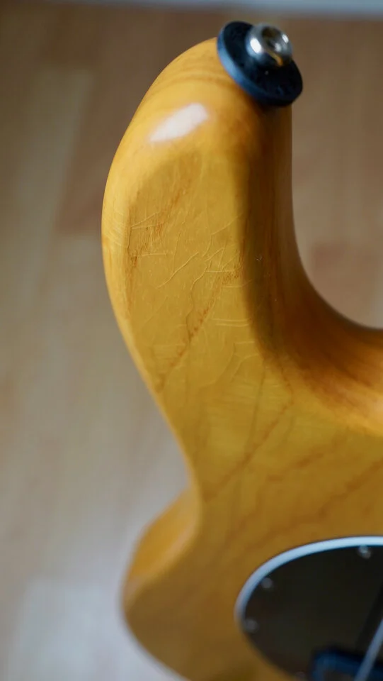 Der Zustand ist gut. Der transparente Nitrolack ist seinem Auftrag gefolgt und über die Jahre würdevoll gecrackelt, zeigt also viele kleine Haarrisse, die man lediglich aus nächster Nähe erkennen kann.