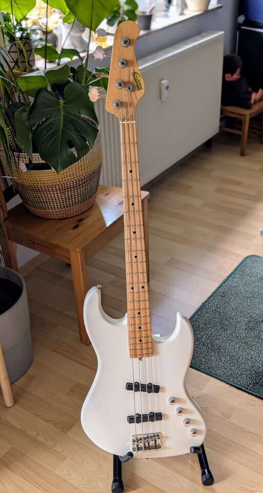 Zum Verkauf steht mein Moon Bass.Er befindet sich techn.in sehr gutem und optisch in gutem Zustand.Es gibt einige Gebrauchsspuren am Korpus und der Kopfplatte,welche meiner Meinung nach einen gewissen vintage Charme verbreiten.PU's sind Bartolini mit aktiver Elektronik ( Bässe/Höhen ).Das Gewicht beträgt 3,8 kg laut meiner Personenwaage.