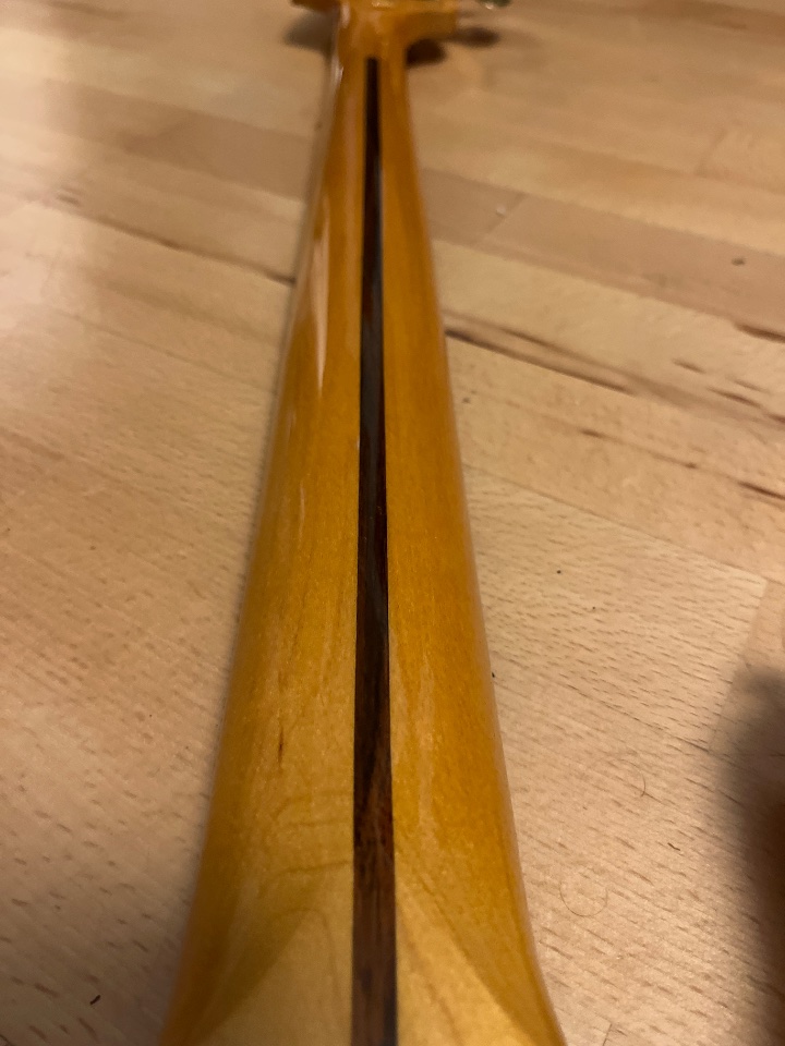 Ahorn mit Palisander Griffbrett. Hals ist lackiert, alles funktioniert. Schöne Patina. Ist grad noch verbaut. Der Hals ist grade und der Spannstab funktioniert.