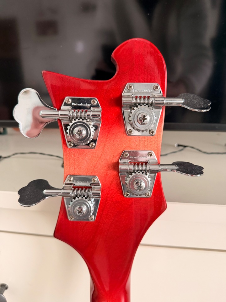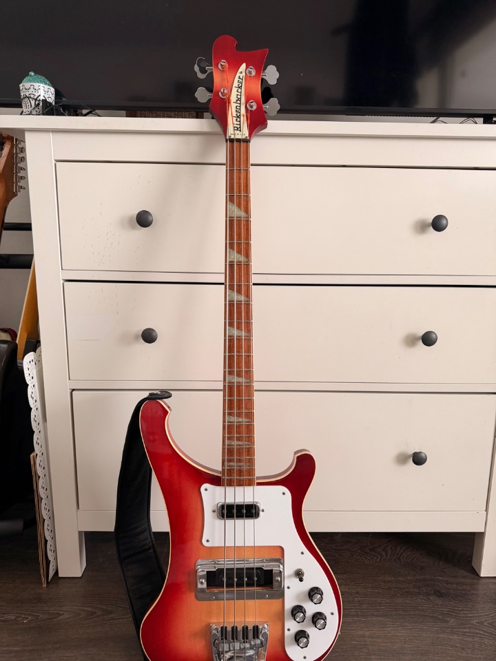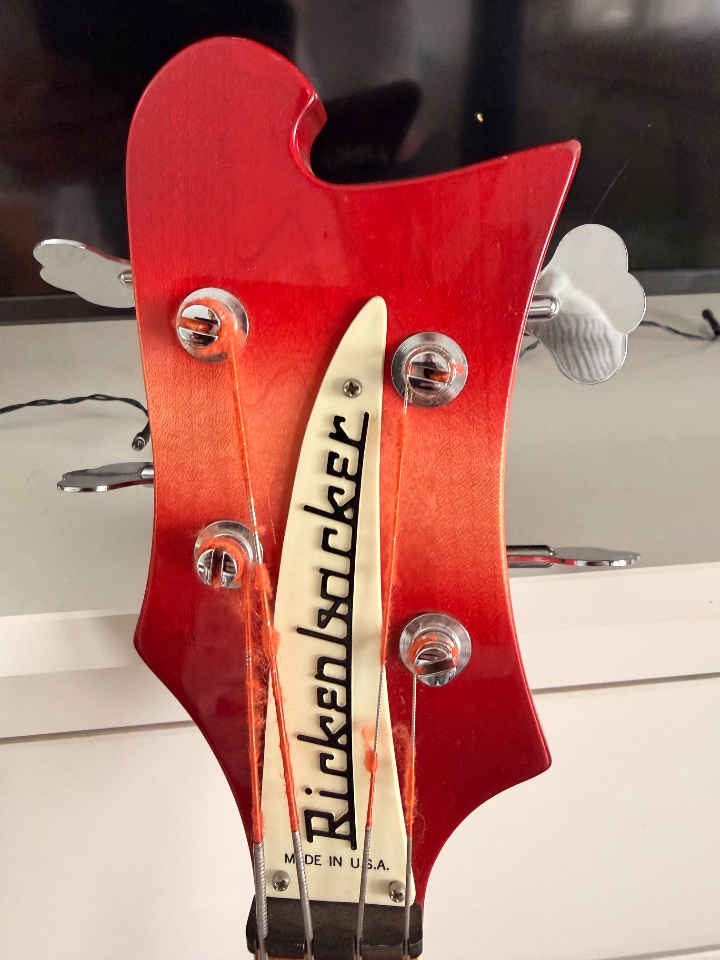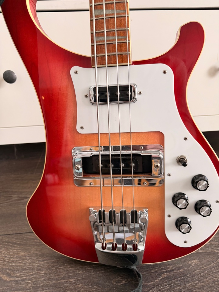 Ich biete hier meinen Rickenbacker zum Verkauf an. Der Bass klingt großartig und ist in einem super Zustand. Er ist etwa 20 Jahre alt, genau weiß ich es nicht, ich bin Zweitbesitzer. Die Elektronik funktioniert, die Bespielbarkeit ist top, ich habe die Bünde bei Launhardt Guitars nochmal abrichten lassen, da ich eine flache Saitenlage bevorzuge. Er hat eine Macke hinten am Body (Siehe Foto), das Gewicht beträgt laut Personenwaage 4,2 Kilo. Der Original Koffer sowie Zubehör ist natürlich dabei.