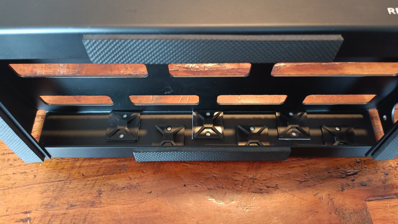 Die Füße habe ich abgenommen und gegen flachere Anti-Rutsch-Pads getauscht. Alle Füße inklusive Befestigungsmaterial und Werkzeug liegen aber bei, falls jemand die Füße wieder montieren möchte.