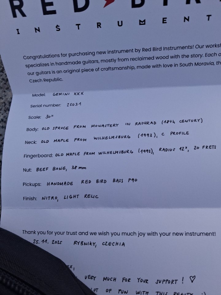 Der Bass kommt mit einem neuwertigen Sandberg Gigbag und mit einem Zertifikat von Red Bird.