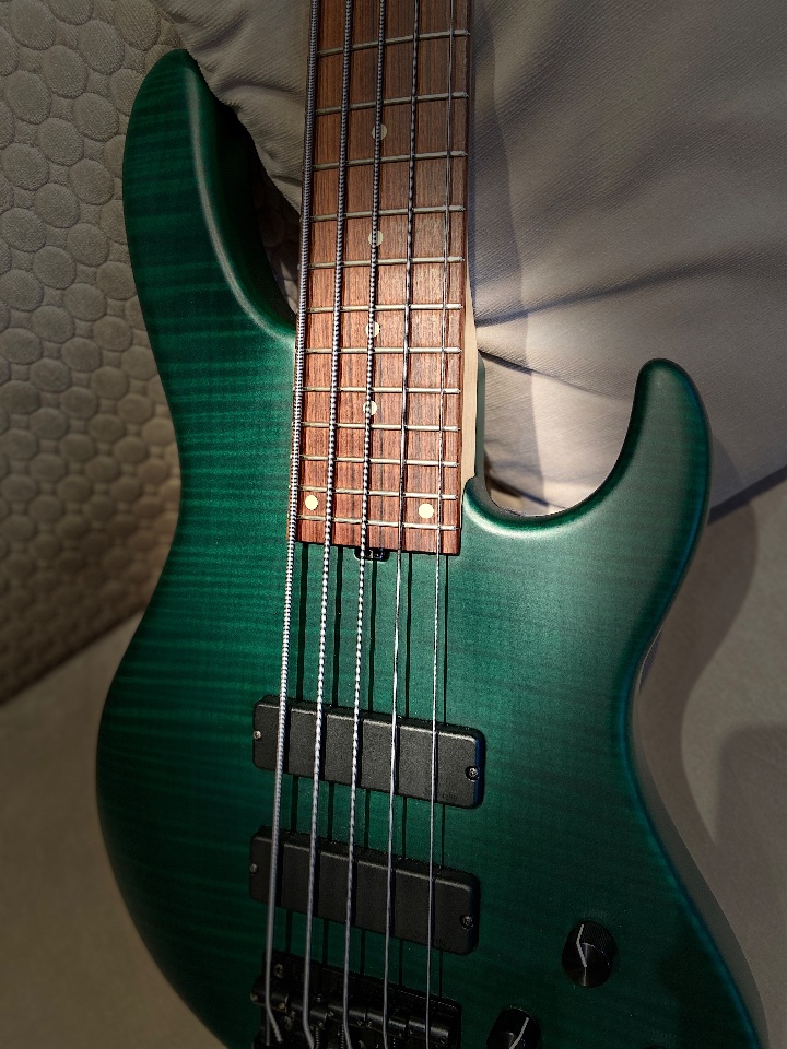 An absolute masterpiece with a lot of attention to detail. The playability is truly outstanding; all notes come out perfectly in every position. Even beyond the 20th fret, everything is spotless. It's particularly worth mentioning that the B string is usable all the way up! 5-string basses often don't have much to offer beyond the F on the B string. Here you can use the Bb at the 11th fret for a line and it still sounds like a tone and not a sound.