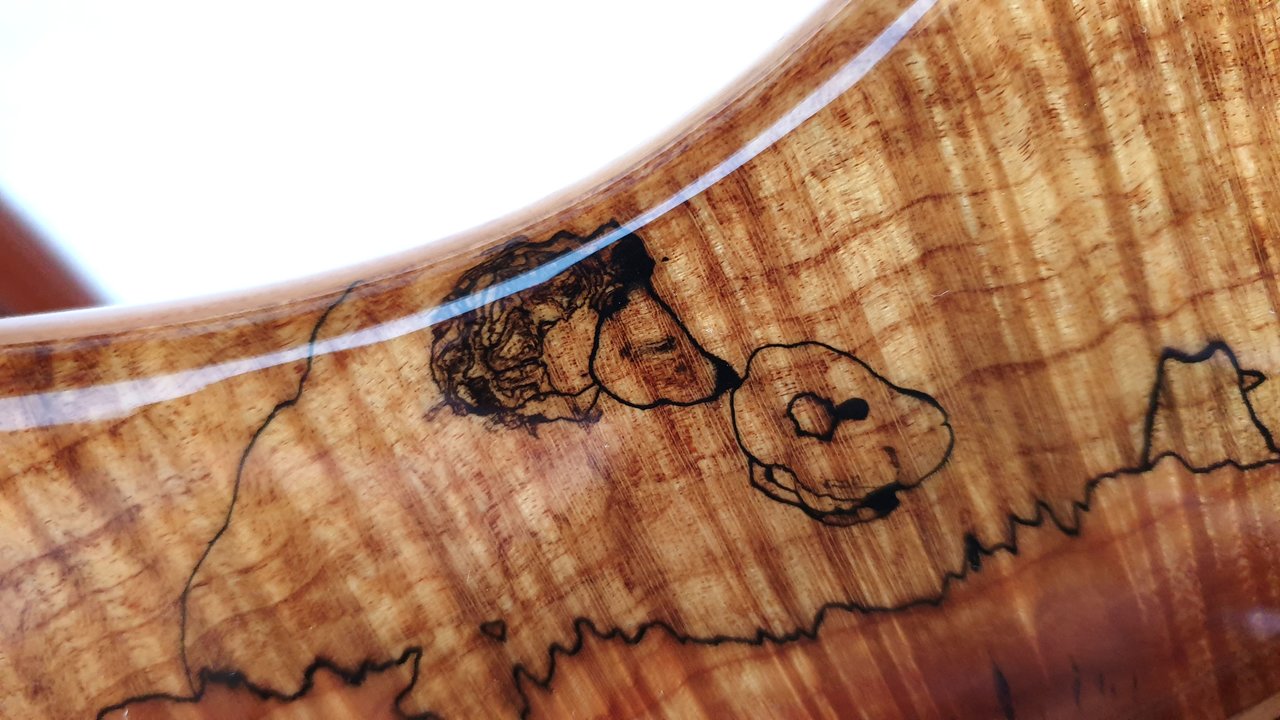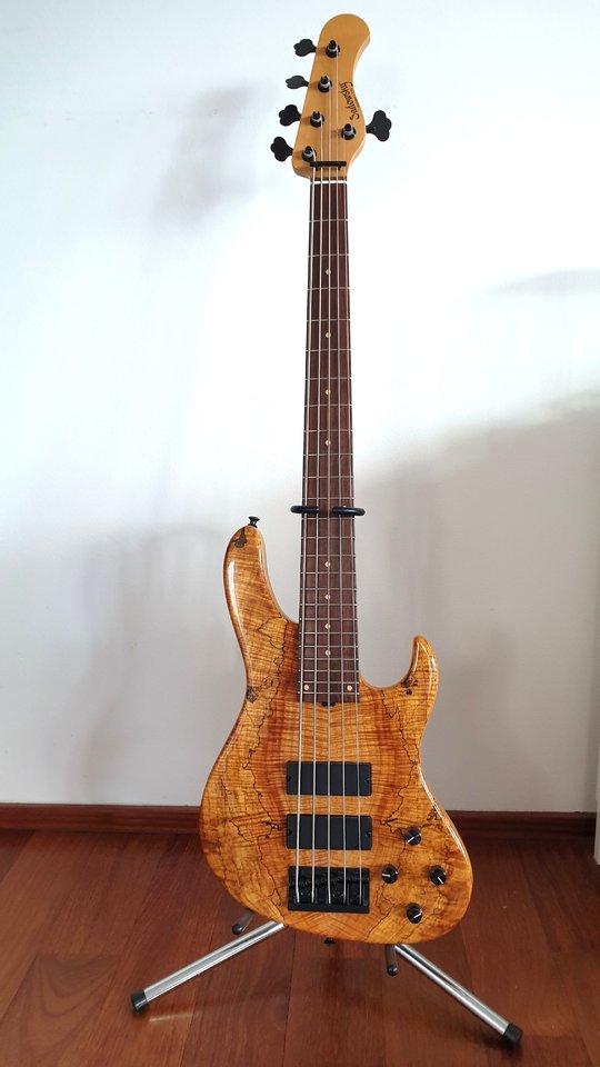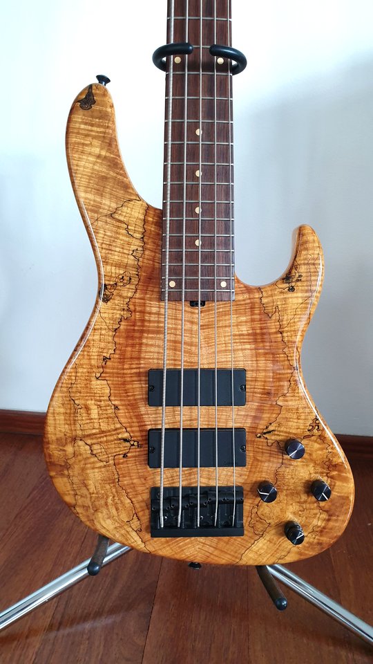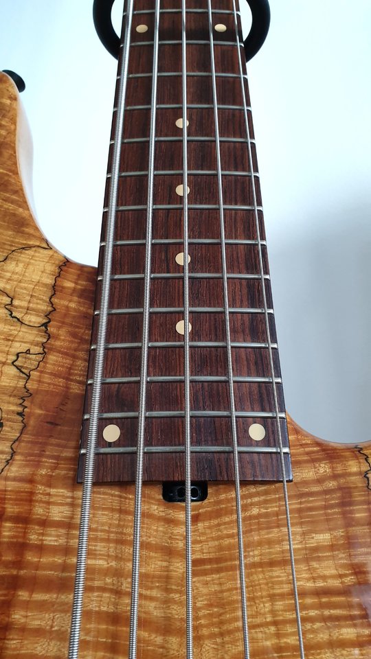 - ash body, spalted maple top, really nice and dark pau ferro fretboard