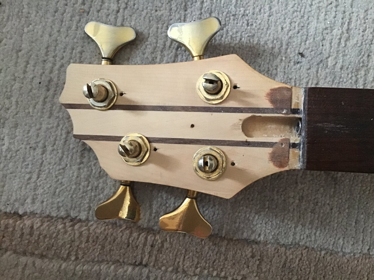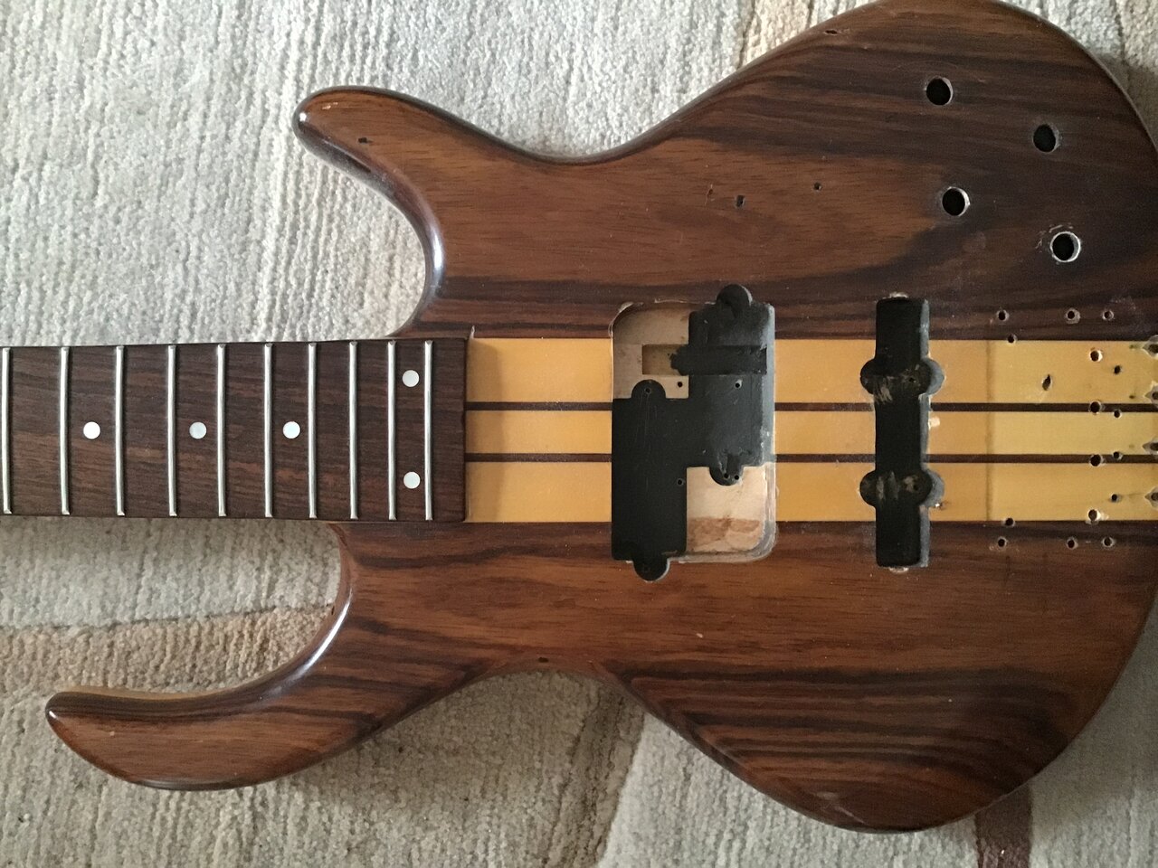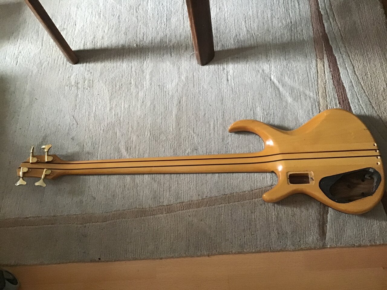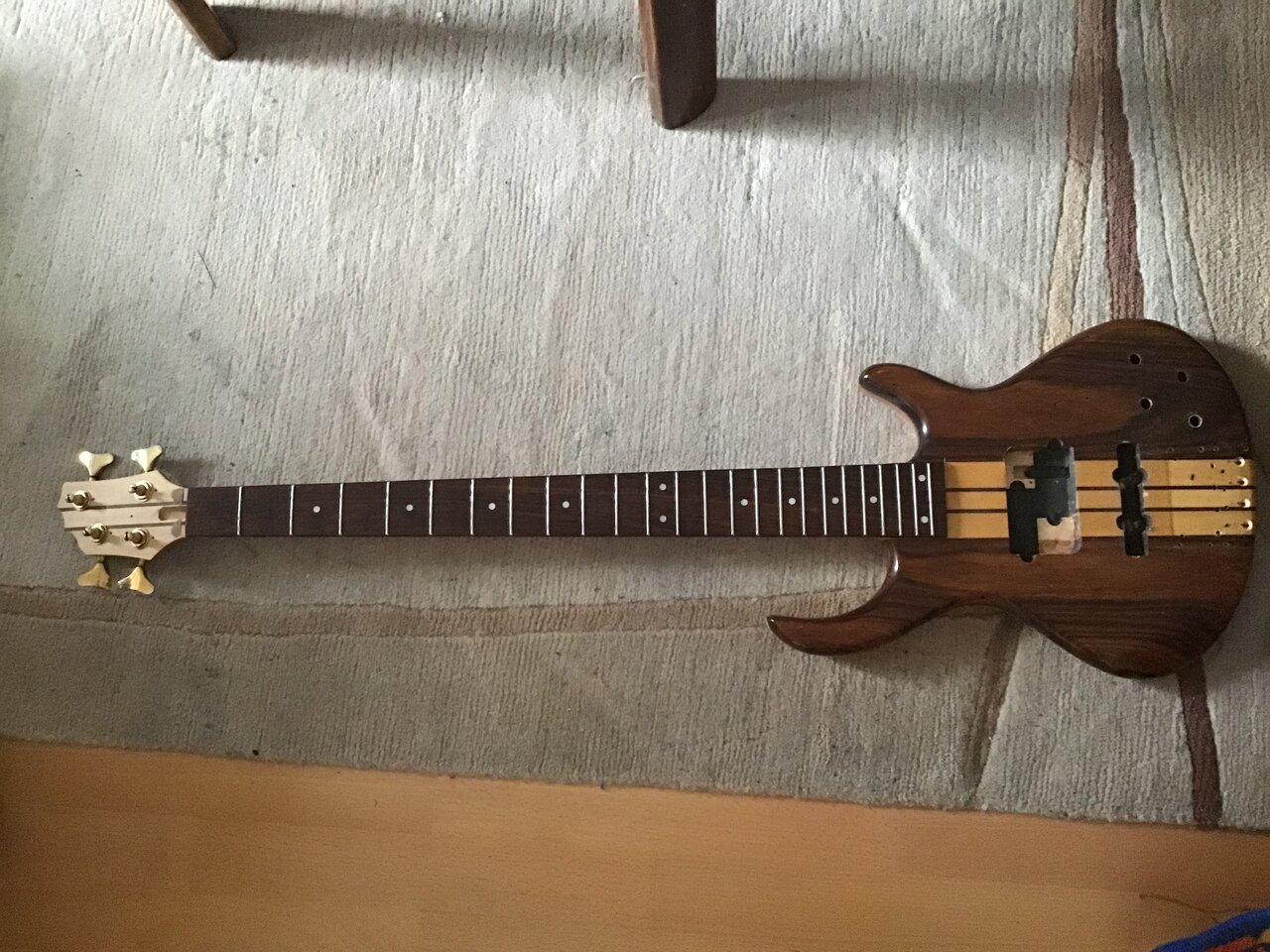 Nachdem ich ihn doch nicht spiele darf er jetzt gehen. Ehemaliger 5-saiter, der mir als Grundlage für einen 8-saiter diente. Gemacht, getan, dann aber nie gespielt. Es sind Bohrungen und Löcher vorhanden. Vielleicht kann jemand was damit anfangen. Recht hocherige Grundkonstruktion mit schönen Hölzern. Am liebsten Abholung. Ich mach mal 50,-; aber schlagt mir einfach was vor.