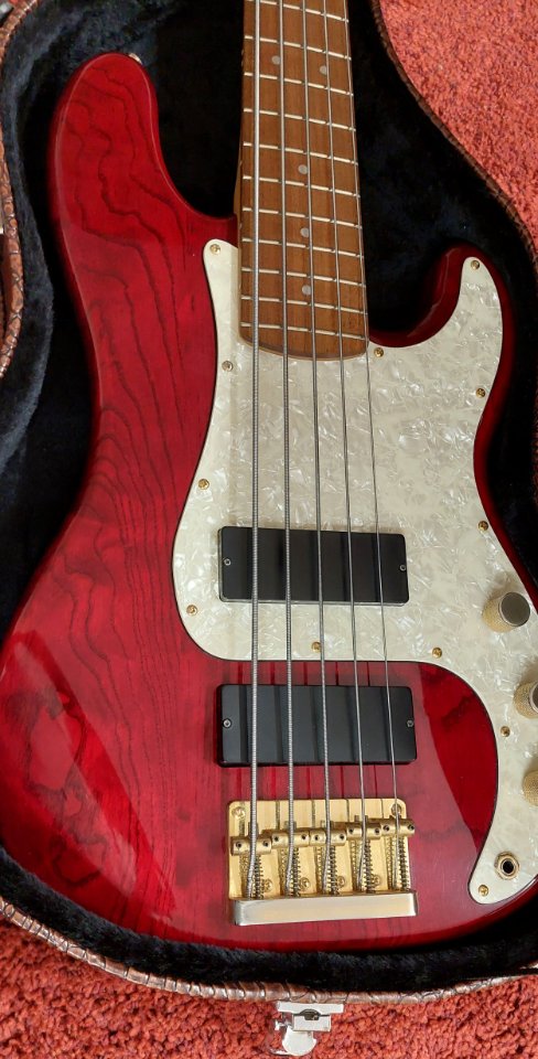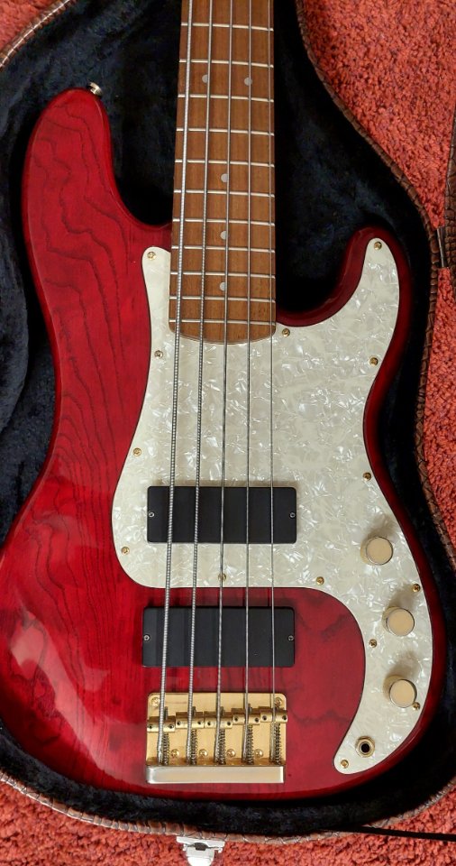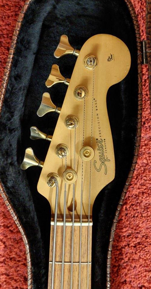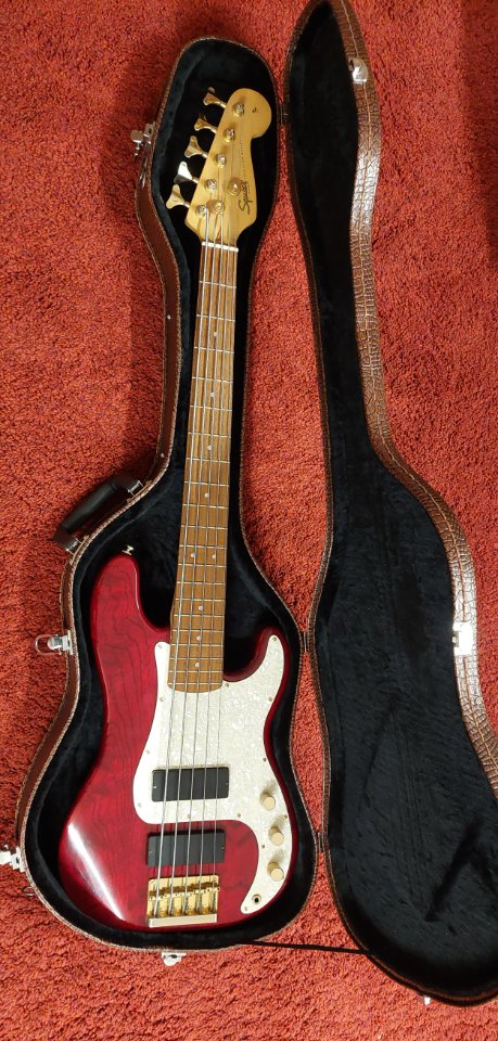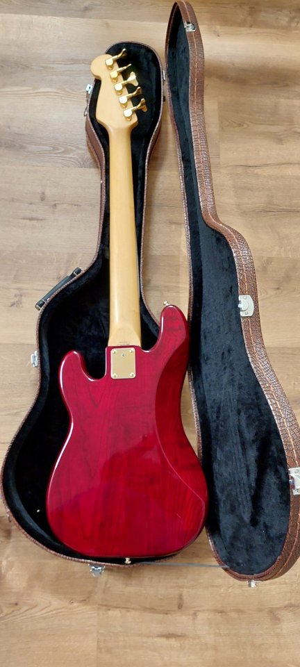 Gebe meinen Fender Squier Pro Tone V ab. Gefertigt 1997 in Korea und im sehr guten Zustand für das Alter. Specs bitte dem Netz entnehmen. Die Serie wurde meines Wissens nach nur für knapp zwei Jahre gefertigt und galt als Spitzeninstrument aus dem Hause Fender/Squier. In dem Zustand ausgesprochen schwer zu bekommen. Der Bass hat eine sehr schöne Maserung unter der transparent dunkelroten Lackierung. Dazu gibt es einen Formkoffer in Kroko-Optik.