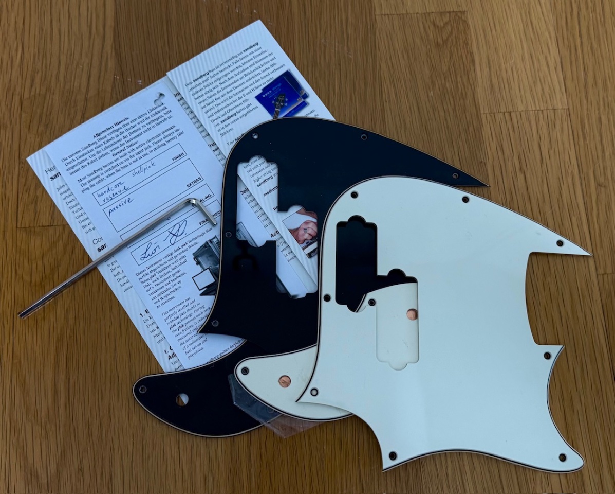 Entspreched sind im Lieferumfang auch zwei weitere Pickguards in Schwarz und Parchment enthalten. Desweiteren dabei: Hangtag, Werkzeug und das Sandberg Gigbag. Der Zustand des Basses ist tadellos, alles inkl. Elektronik funktioniert wie es soll, die Bünde und Trussrod lassen keine Wünsche übrig. Spielt sich typisch Sandberg wie von selbst.