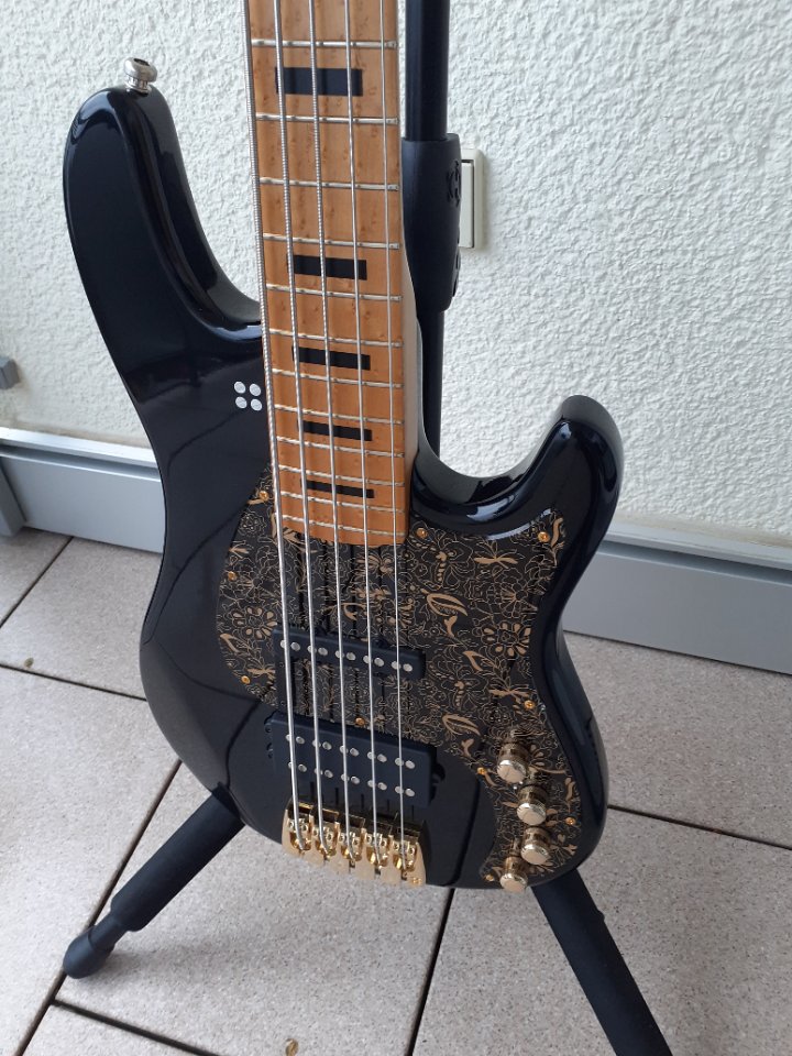 Bass ist in Top-Zustand, Baujahr 2024. Erle Korpus, Vogelaugenahorn Griffbrett mit fluoreszierenden Side Dots, Vibration Treatment, soft aged.