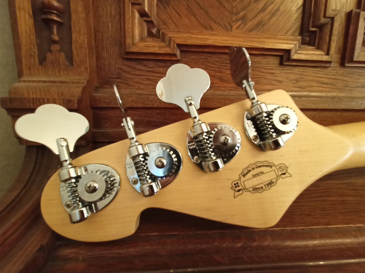 - sehr schöner fein gemaserter Ahorn-Hals mit Ahorn-Griffbrett ohne Dots