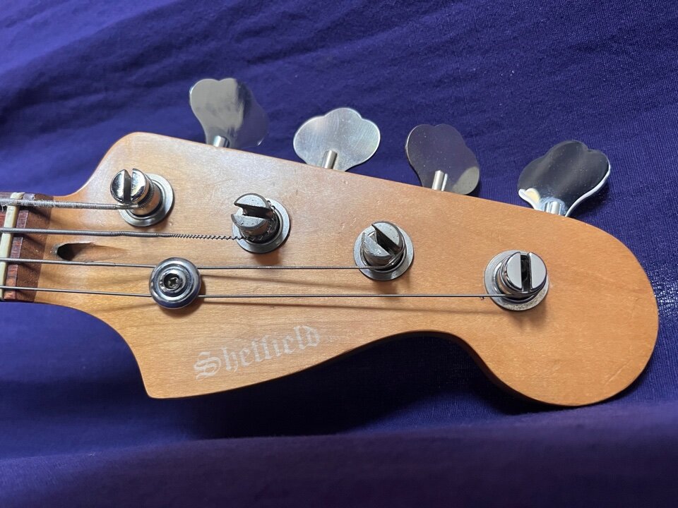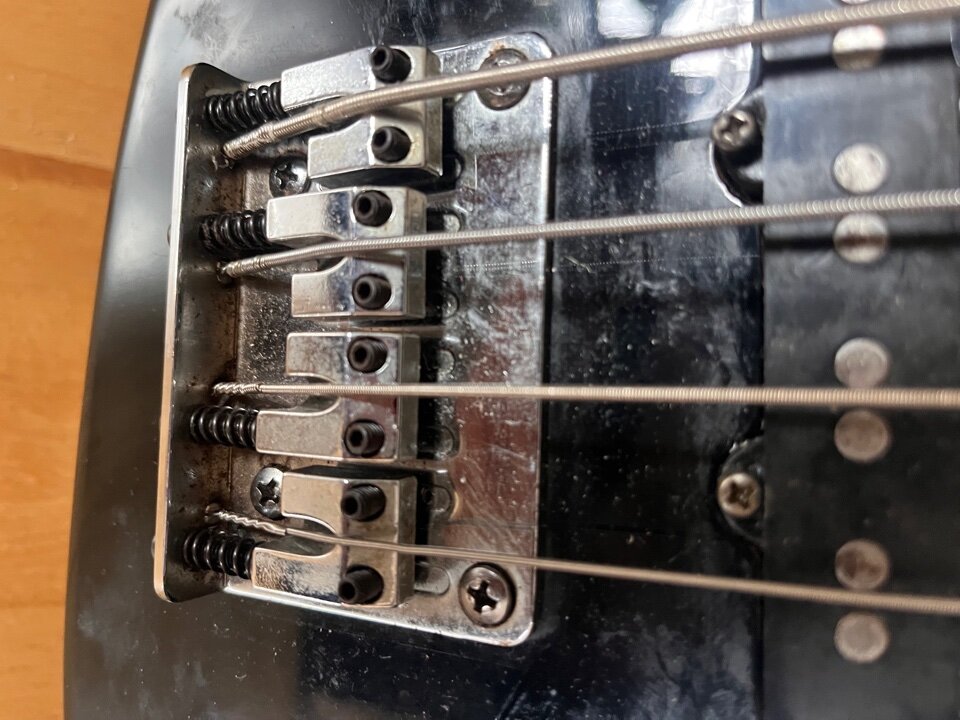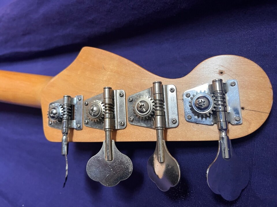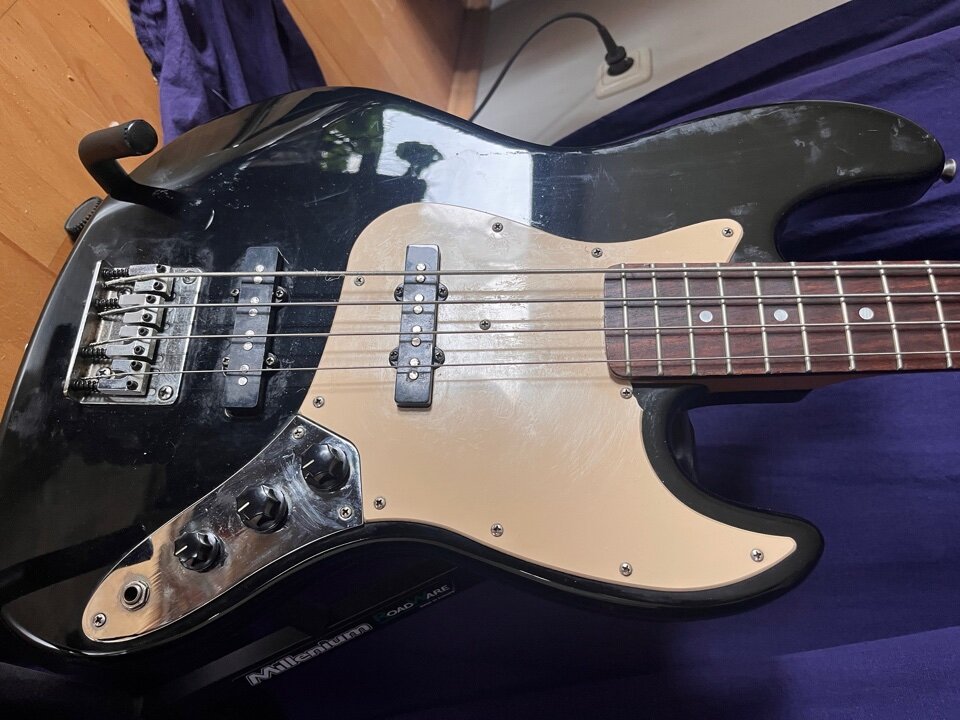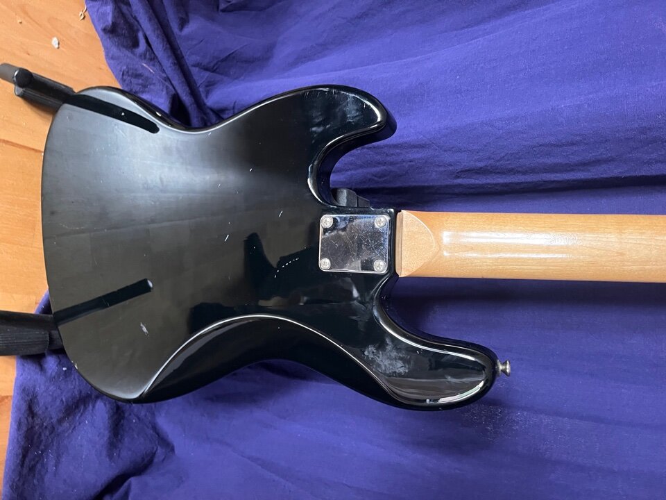 gute 90er Jahre Kopie des Klassikers. Ahorn Hals, Korpus schwarz (Holz massiv aber ?), 4500 gramm, Bünde sehr gut, Elektronik funktioniert, Saitenlage gut, Halsstab gut, massive Brücke. Hier zum Tausch gerne gegen eine gute Stingray Kopie...