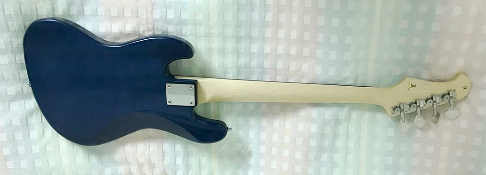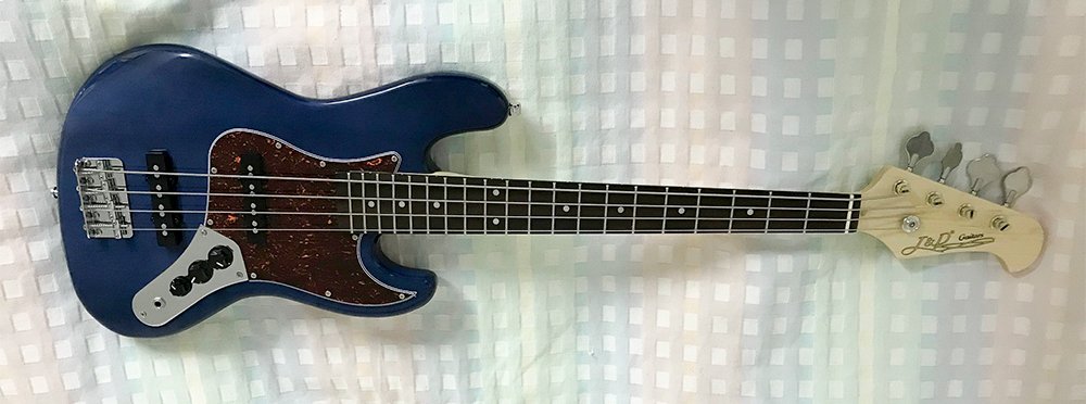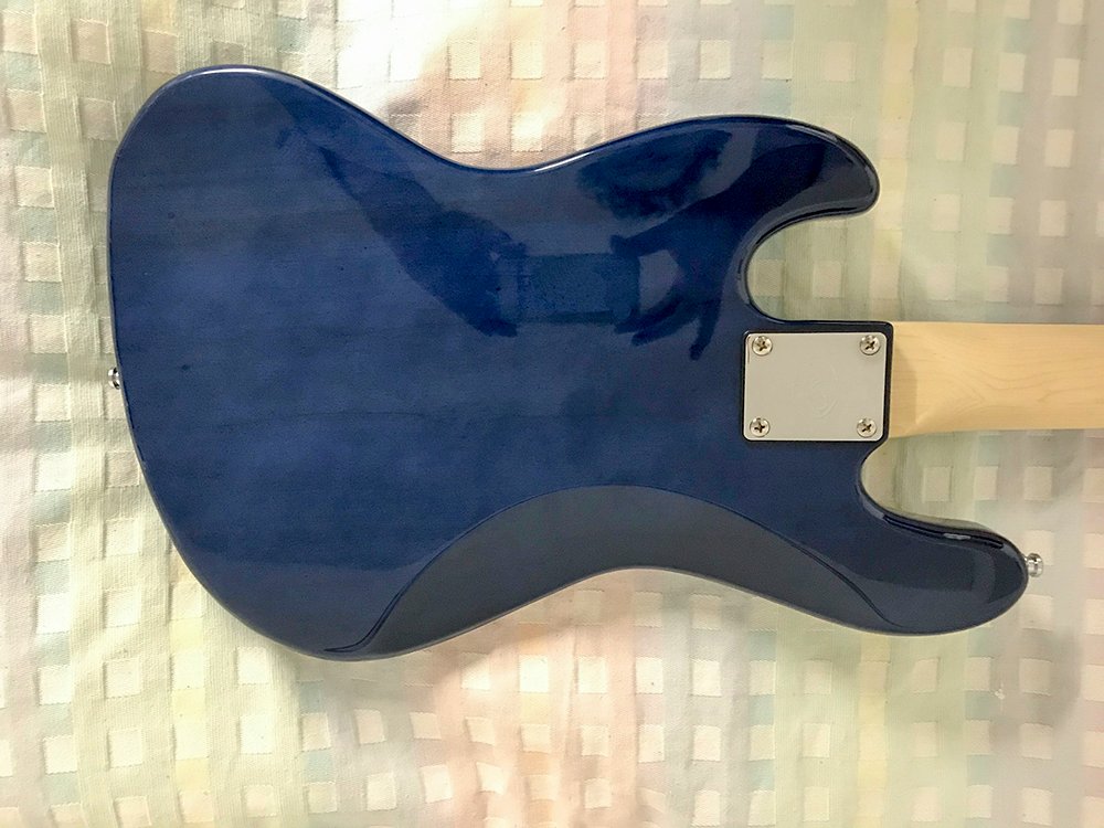 Schöner Shortscale Jazzbass von J&D in See Thru Blue, die Farbe ist schöner als auf den Fotos. Mensur 29“, Halsbreite am Sattel 39 mm, Erlekorpus, Ahornhals, offene Mechaniken, Gewicht nur etwa 3 Kilo! Erstaunlich viel Bass für’s Geld. Passende neue Tasche mit Rucksackgarnitur ist dabei.