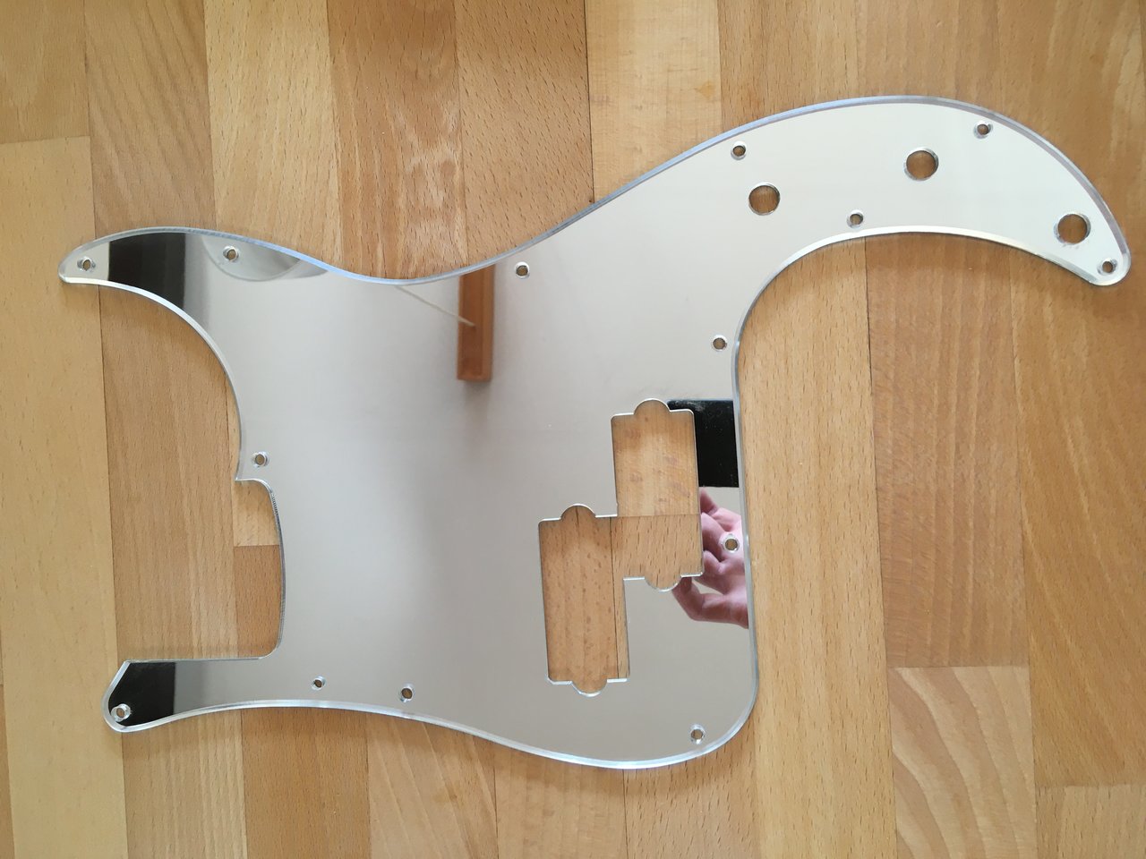 Habe einen gebrauchen Fender Mex Standard P-Bass erworben, wo der Vorbesitzer diese Pickguard montiert hat. Dazu wurde noch ein Thumbrest genutzt, daher hat das Schlagbrett jetzt 14 Löcher. Es wurde genutzt. Sprich man sieht da schon ein paar scratches auf dem scratch plate