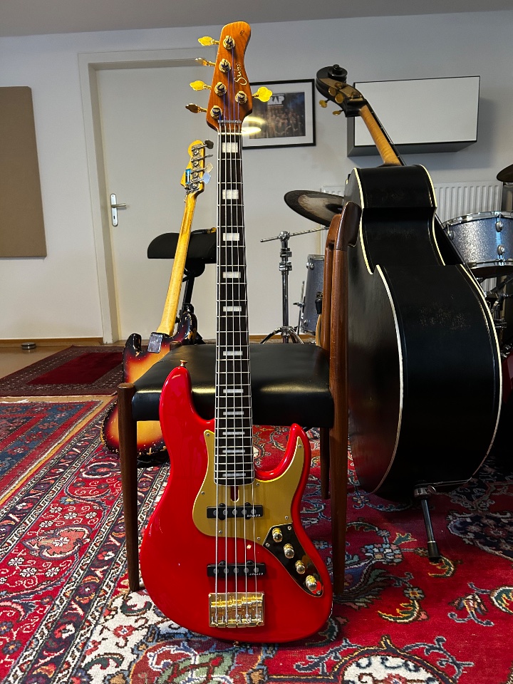 Sire 24 5-String, gemodded mit Delano PUs, Noll 3-Band Elektronik, Sandberg Mechaniken, Gotoh Brücke und Dunlop Security Locks.