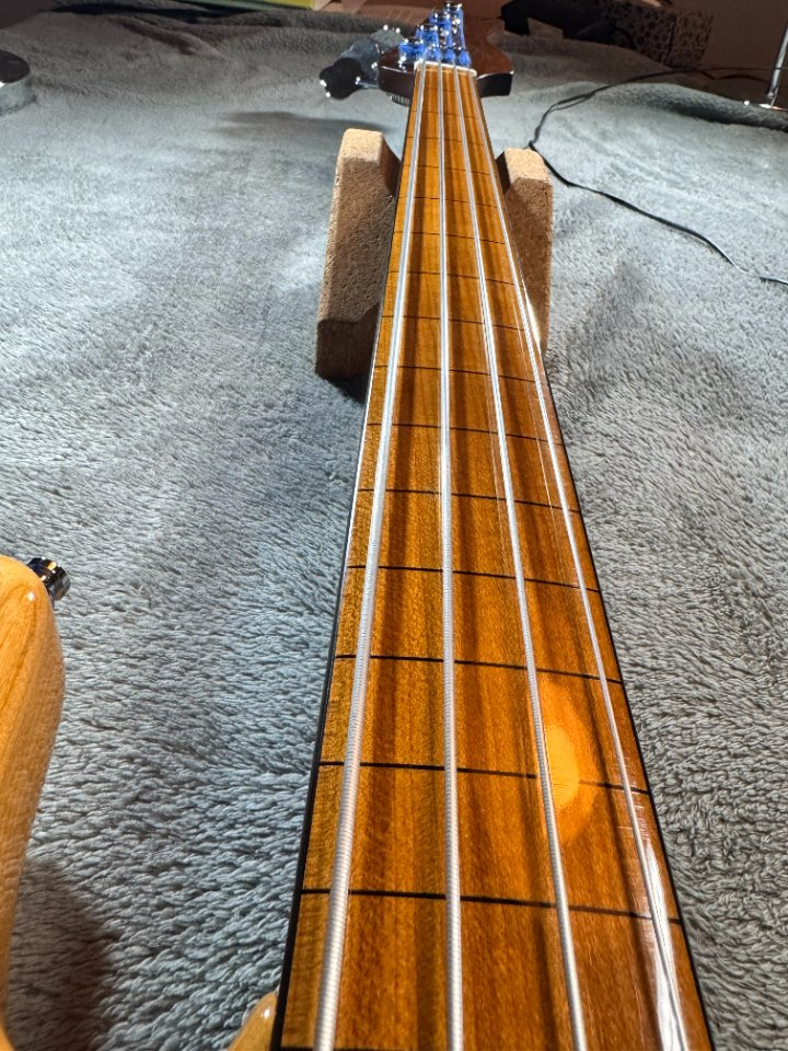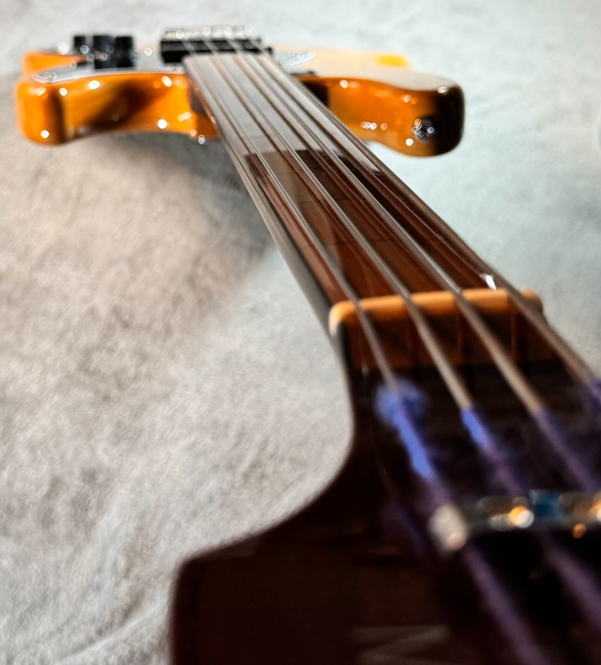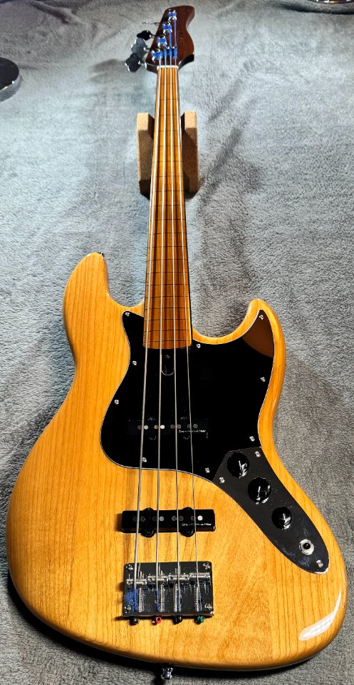 Der Fretlessbass hat einen Erlekorpus, einen roasted Ahornhals mit Ahorngriffbrett und einem modernen C- Profil mit 34“ Mensur. Der seidenmatte Hals hat typische Jazzbass- Maße und abgerundete Kanten und spielt sich wunderbar. Zur besseren Orientierung beim Intonieren hat er ins Griffbrett