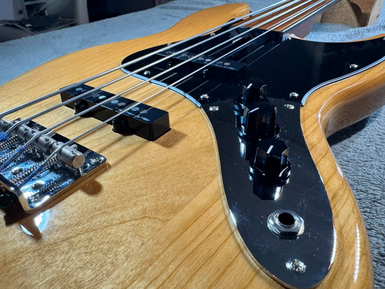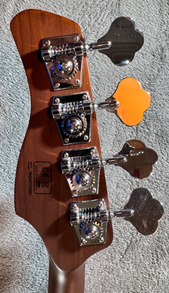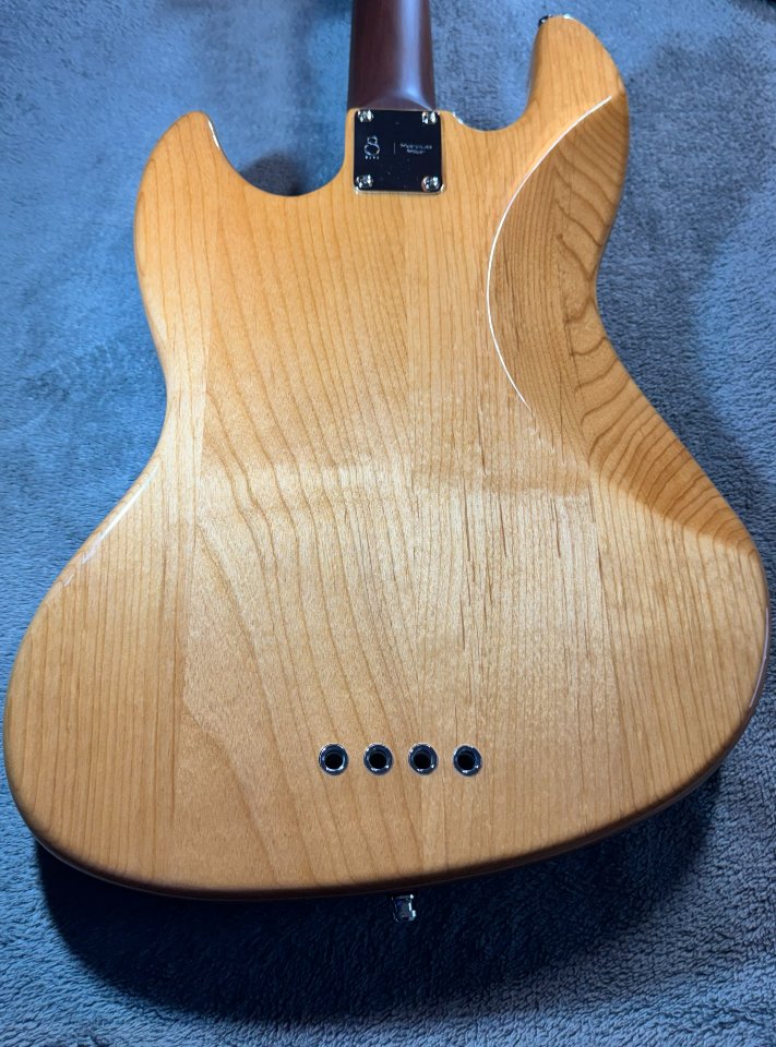 Das naturfarbene Instrument besitzt 2 Marcus Vintage-J Revolution Jazz Single Coils, 2 Volume- Regler und einen Tonpoti. Er verfügt über eine Vintage- Brücke, die etwas massiver ist als die typischen Blechwinkel. Die Saitenreiter der Brücke haben Rillen, so das man in gewissen Maße noch die