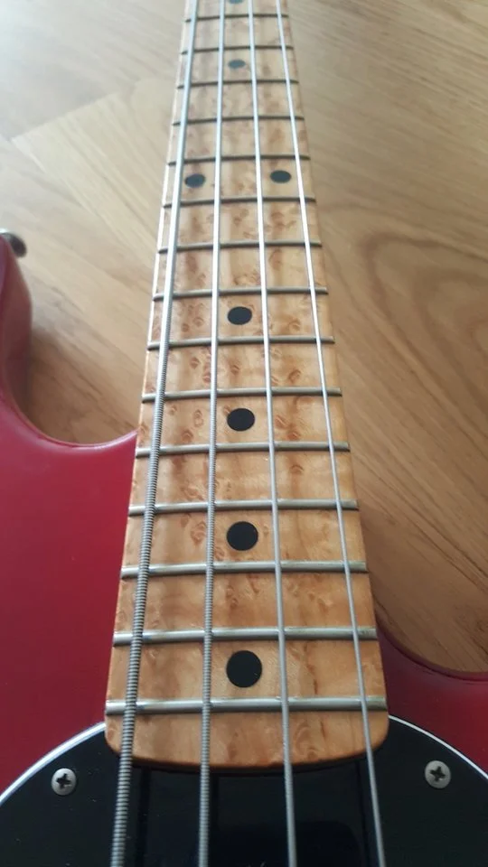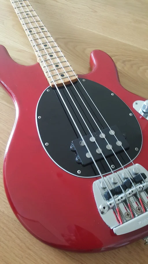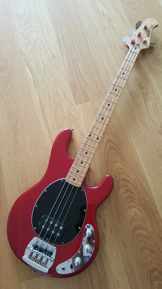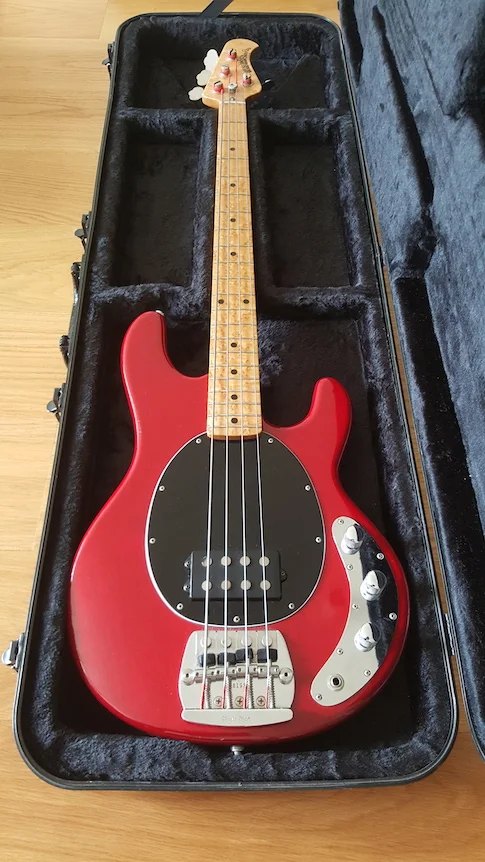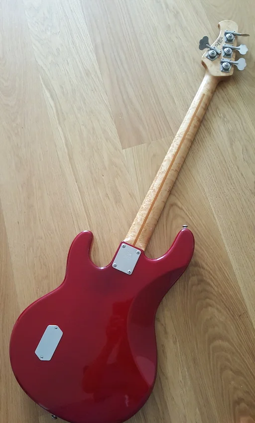 1989 Musicman Stingray in Translucent Red with very beautiful Birdseye Maple neck. The bass is in a very good condition. Comes with non-original hardcase.