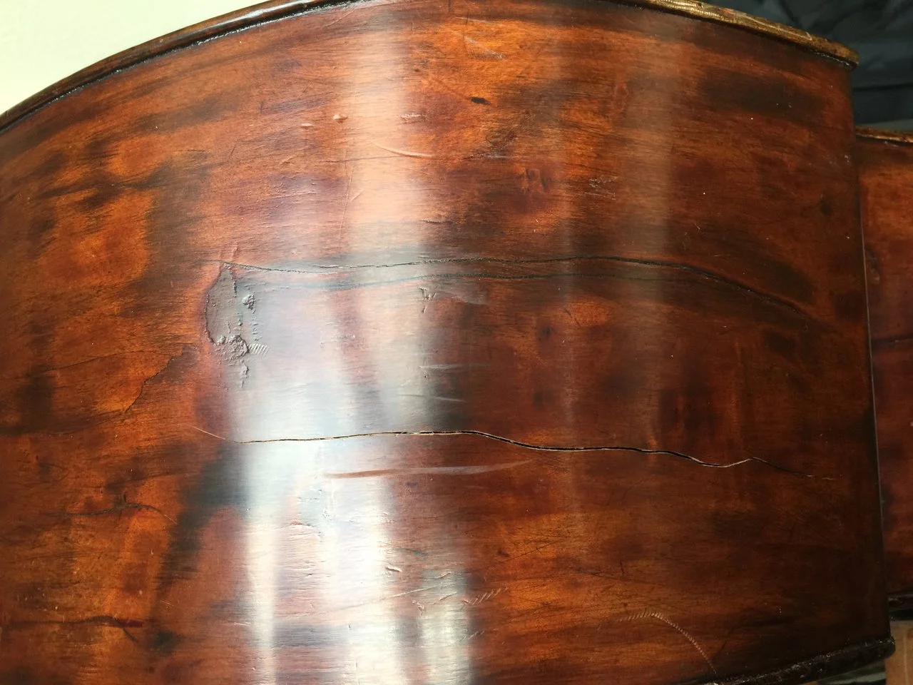 Zustand: hat viele Spuren über die Jahre abbekommen, die aber funktional nicht relevant sind, er hat 2 Risse im Korpus, die repariert werden können; im Moment stören die den Klang nicht. Kann ich nach Absprache reparieren lassen.