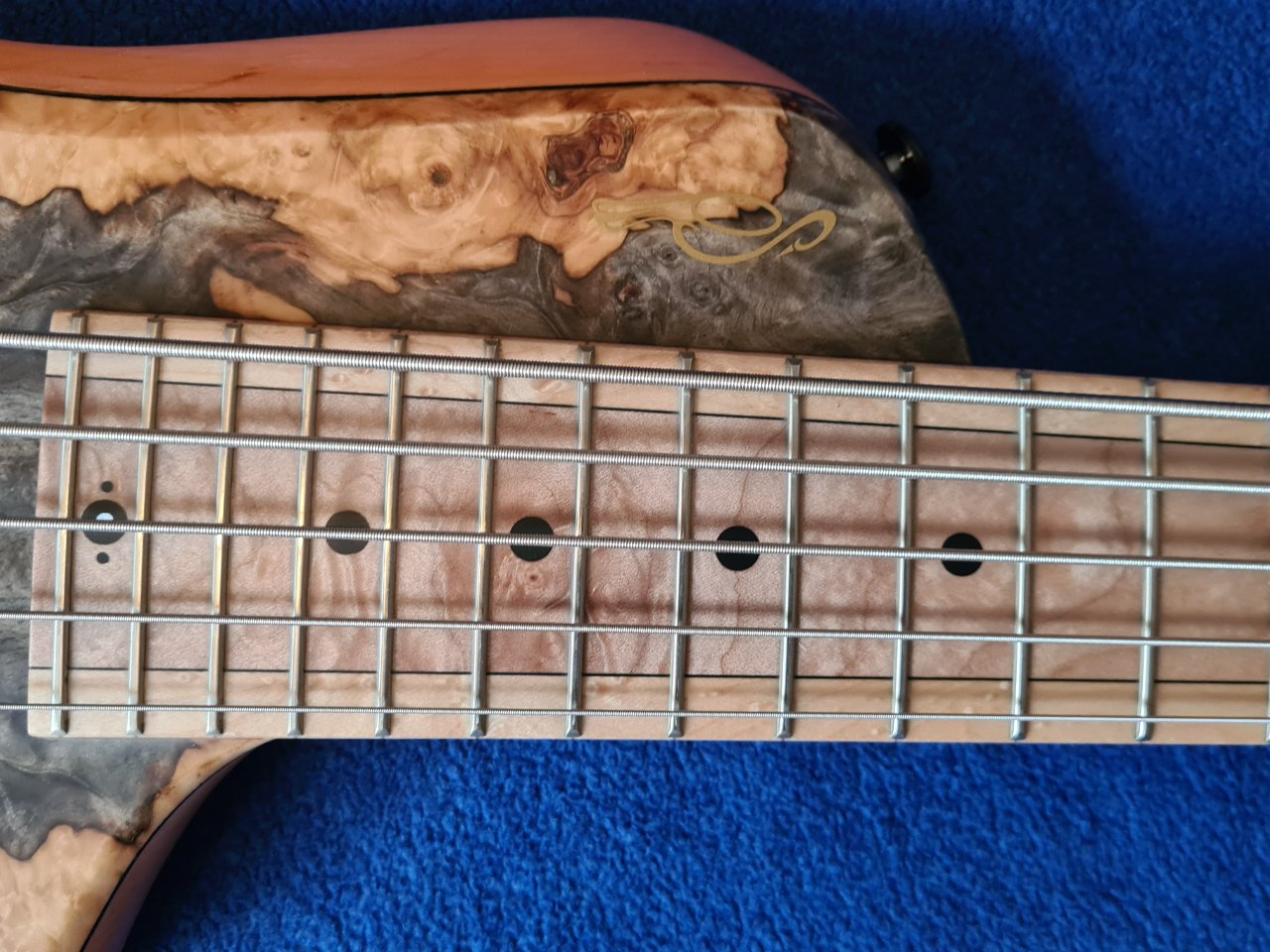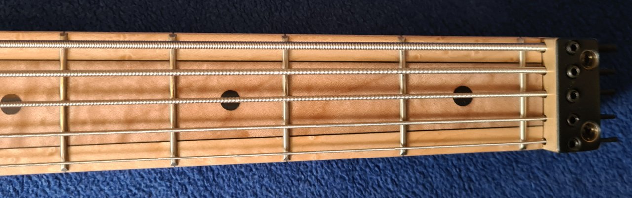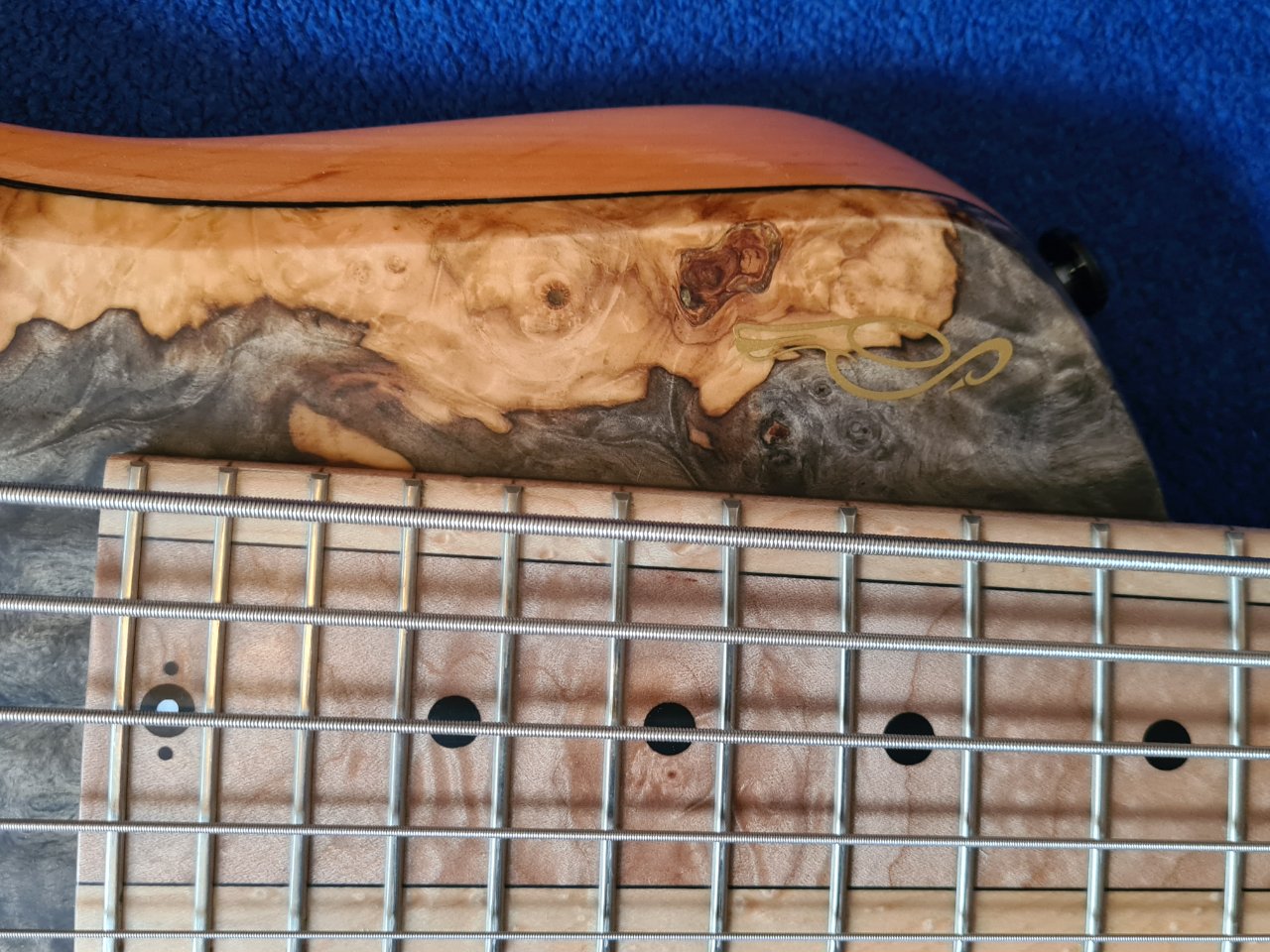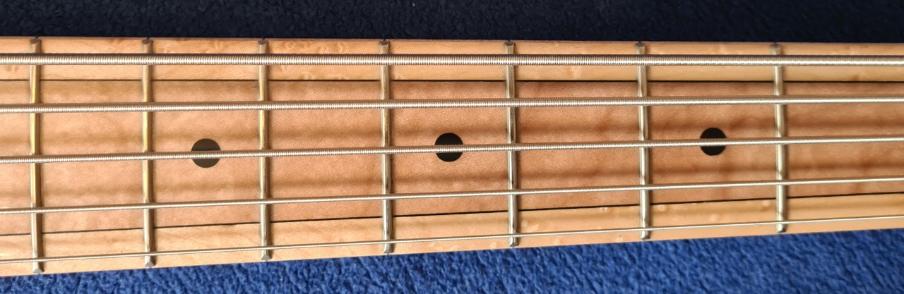 Dass seine Handwerkskunst unglaublich ist - man sehe sich nur das Griffbrett an, das ist ja mehrteilig und folgt den Linien der Saiten perfekt - kann man schnell sehen. Dass der dreiteilige Hals perfekt ist, der bequemste und am besten zu bespielende den ich jemals in Händen halten konnte, kann man leider nicht auf den Bilder sehen.