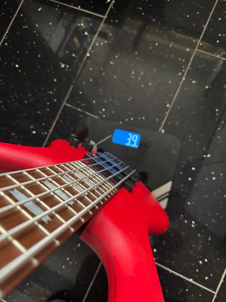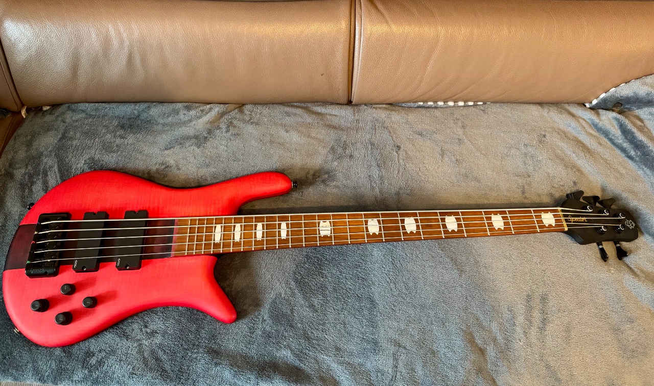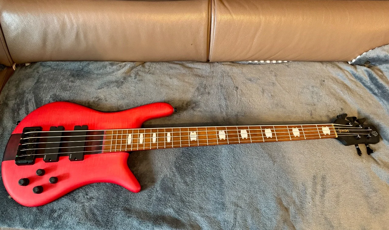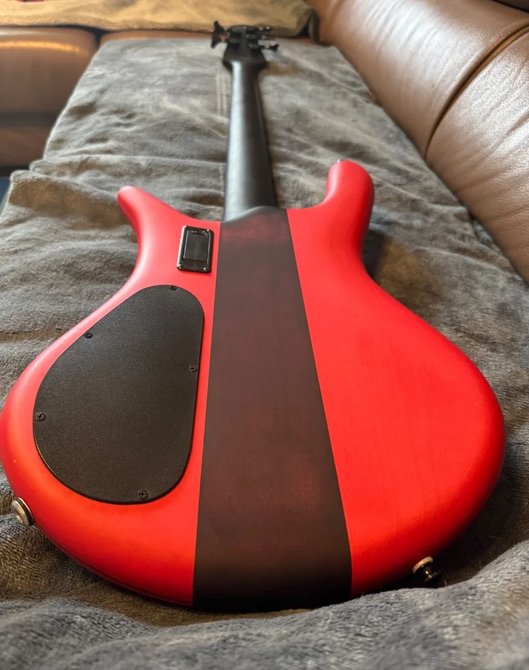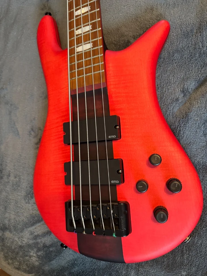 Das Instrument spielt sich fantastisch und klingt durch die EMG-Elektronik richtig druckvoll. Der rote Mattlack ist ein absoluter Blickfang auf der Bühne.