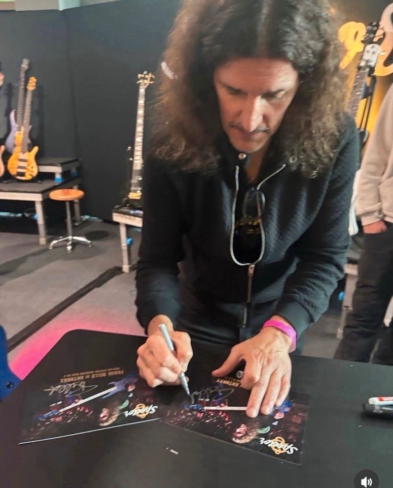 Spector Icon Frank Bello (Anthrax) Signature Bass. Signiert von Frank Bello auf Vorderseite, zusammen mit einer Spector Werbekarte.