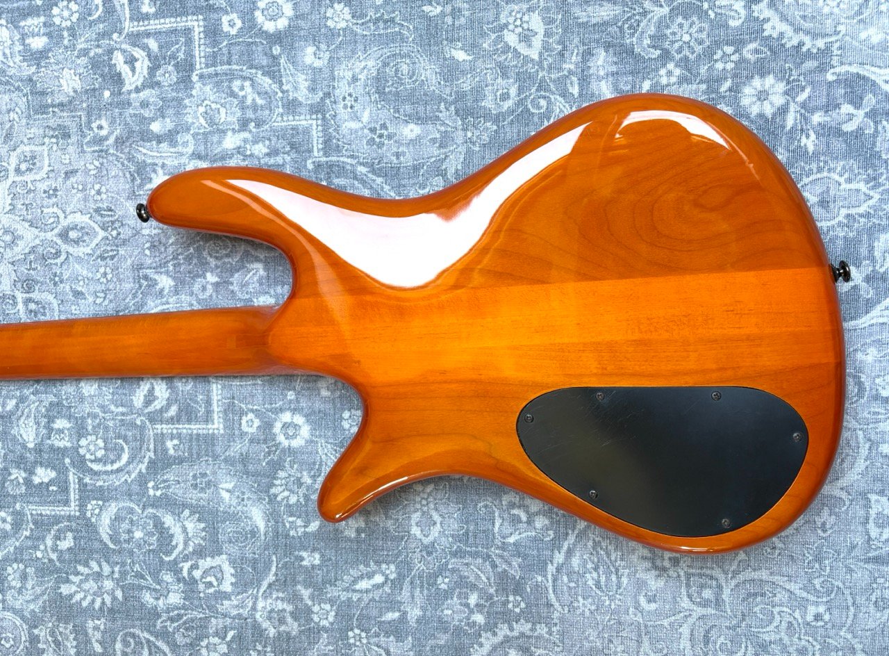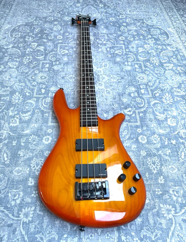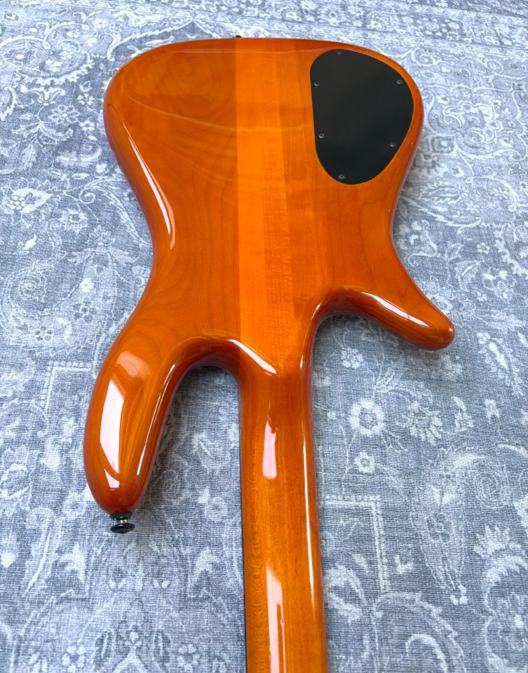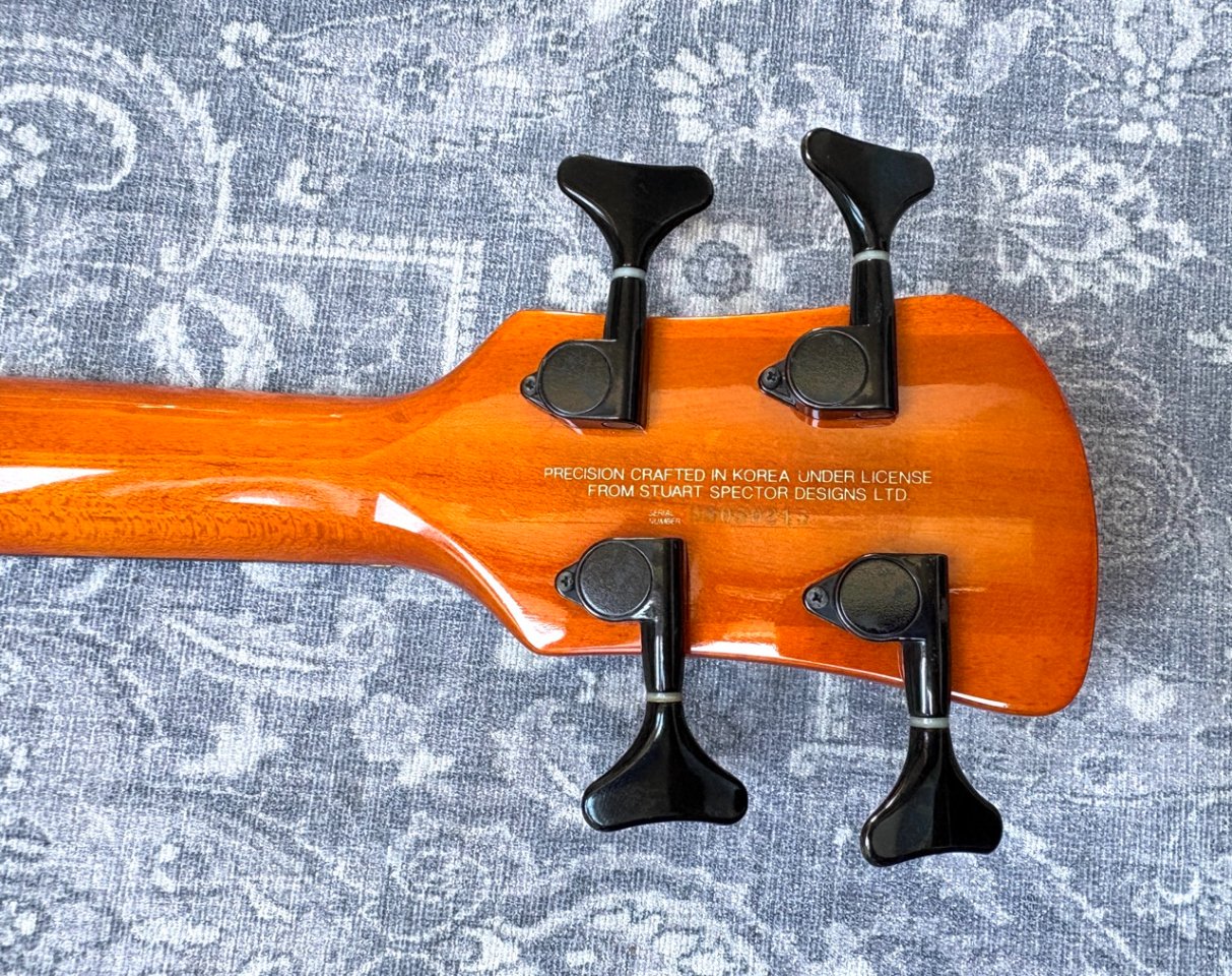 It is a very comfortable instrument to play. It is light weight (3,9 kilos) and balances well. The neck is slim, straight, the fretwork is good and the action is low. The nut width is around 40 mm. The sound is what you expect from a Spector, growly and deep, which sits very well in the mix with other instruments. It is in good shape for a 25 years old instrument, it has a few very small spots but otherwise looks very clean. It has a fresh battery and new Markbass strings.