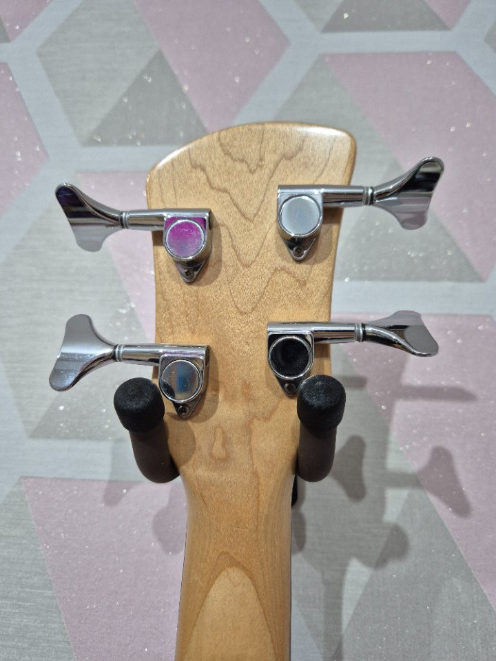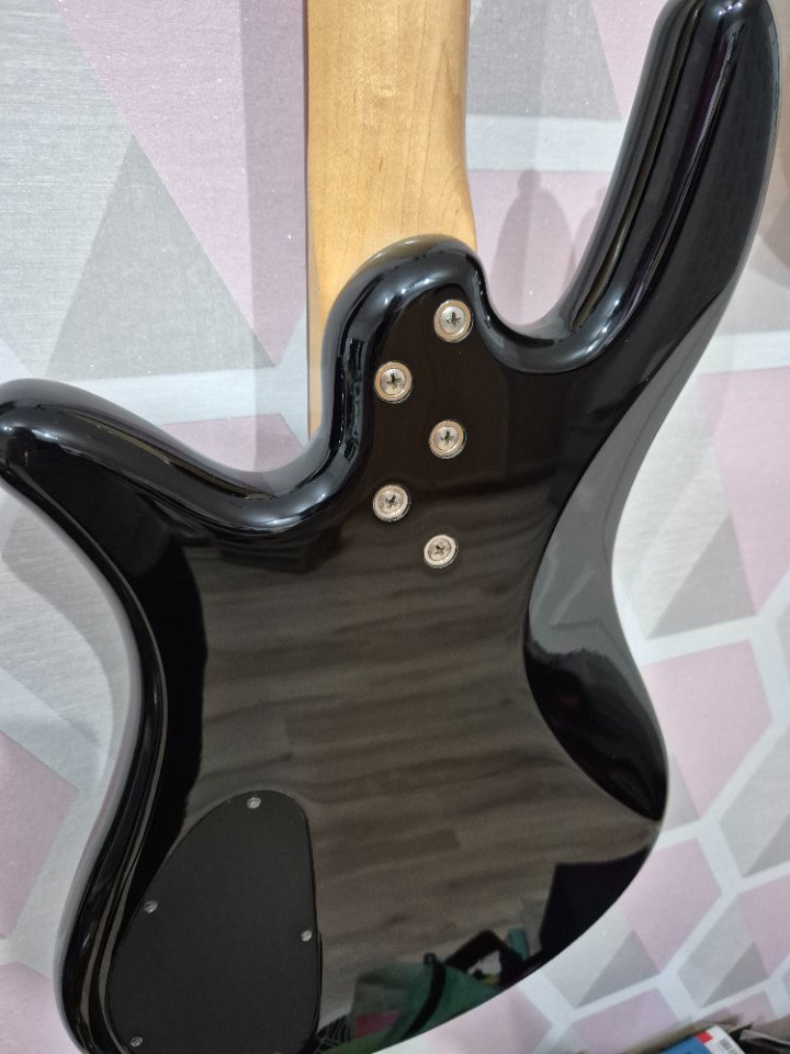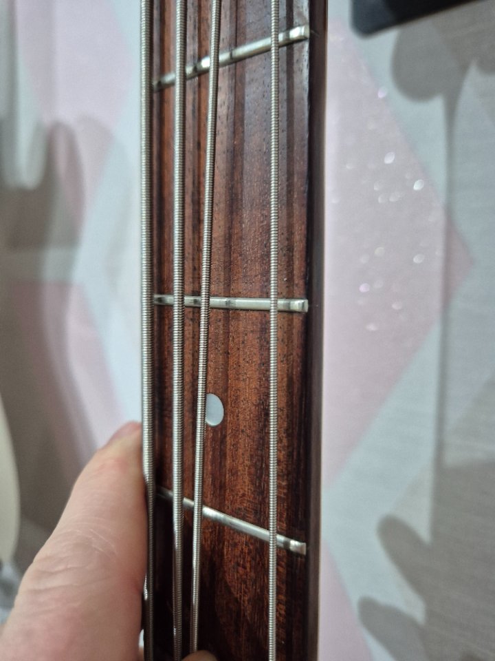 Der Bass war Ende letzten Jahres noch beim Gitarrenbauer. Dort wurden die Bünde neu abgerichtet, die Elektronik überholt und die Halstasche kontrolliert und etwas nachgearbeitet. Der Vorbesitzer hatte hier, warum auch immer, Funier zwischen gelegt.