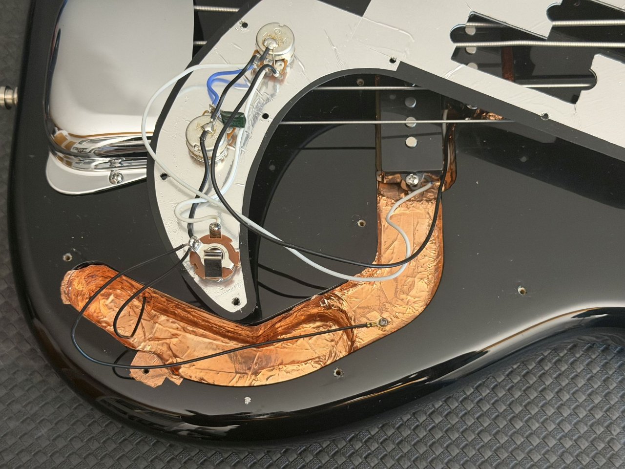 Aschenbecher wurde auch vom Vorgänger draufgemacht, ich habe einen Satz Fender Flats aufgezogen - die haben nur wenige Stunden Spielzeit. Das Elektronikfach ist mit Kupferfolie ausgekleidet. Daumenstütze ist auch montiert.