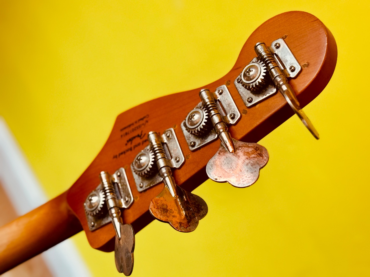 Zwischenzeitlich waren mal andere Mechaniken verbaut, die schließlich auf einem anderen Bass gelandet sind. Nun sind wieder die Original-Mechaniken verbaut. Sie sind eher Heavy Relic, siehe Fotos. In der Kopfplatte befinden sich wegen des Wechsels ungenutzte, aber wieder verschlossene Schraublöcher. Durch den Sandberg-Saitenniederhalter hat die A-Seite gut Druck auf den Sattel.