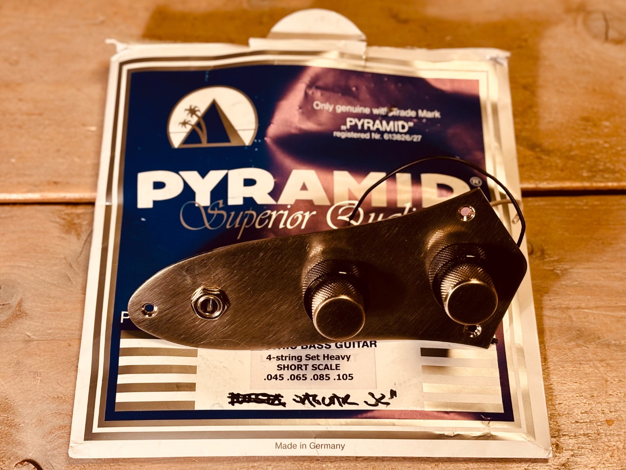 Aktuell ist der Bass mit Galli JF Flatwounds .045 - .105 bestückt. Für Rounds war ich ganz zufrieden mit den Pyramid Nickel Rockshorts .045 - .105, die auch für diesen Medium Scale passen. Ich lege den eingespielten Wechselsatz dazu, außerdem noch die ursprüngliche Control Plate mit gestackten Potis, wer damit experimentieren möchte.