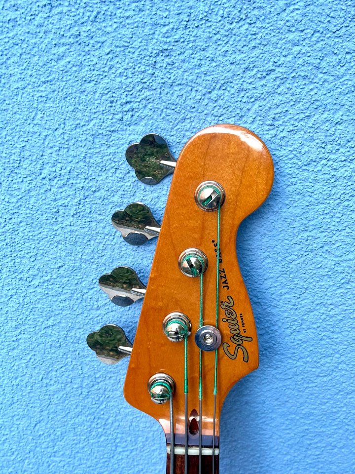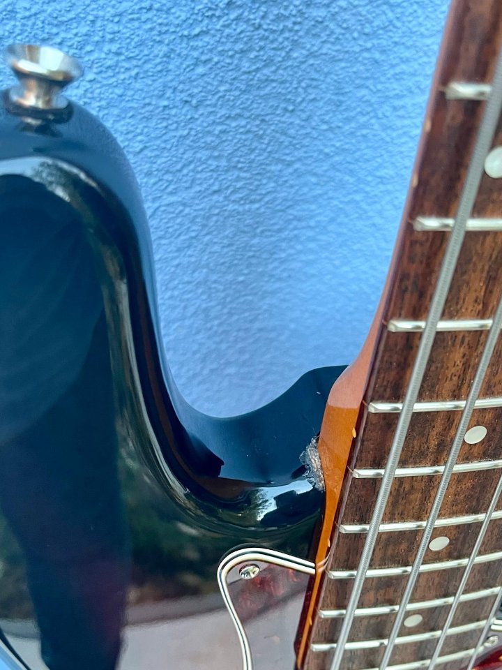 Eigentlich wollte ich schreiben ohne jegliche Dings und Dongs, denn er sieht wirklich aus wie fabrikneu. Aber es gibt doch tatsächlich zwei Macken: einen kleinen Lack-Abplatzer an der Halstasche (der in Wirklichkeit viel unauffälliger ist als auf dem Foto) und eine kleine Stelle an der Rückseite der Kopfplatte (kann man auf dem Foto erahnen, und genauso unauffällig ist sie auch).
