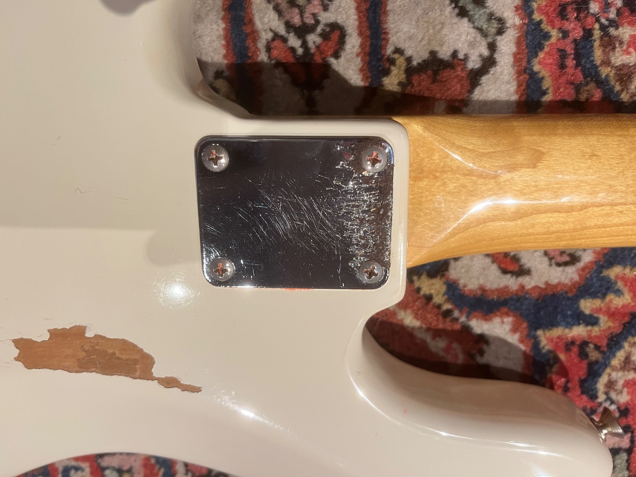 Optisch hat der Body etliche Macken. Auch die Platte, an der die Potis befestigt sind, und die Halsplatte zeigen ihr Alter. Leider ist auch die Seriennummer nur schwer zu erkennen. Aber – ich lege meine Hand ins Feuer – das ist ein Jazz Vintage.