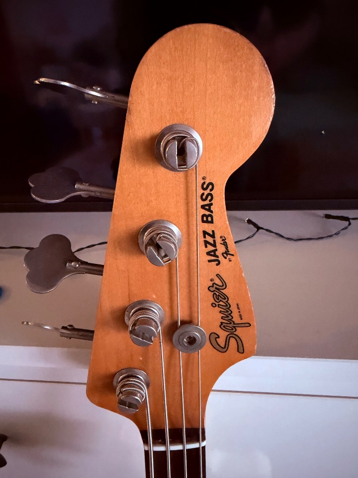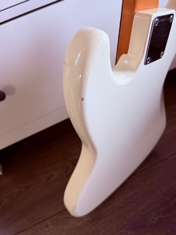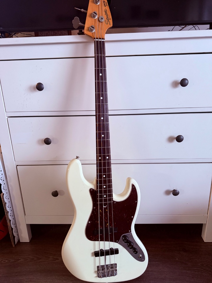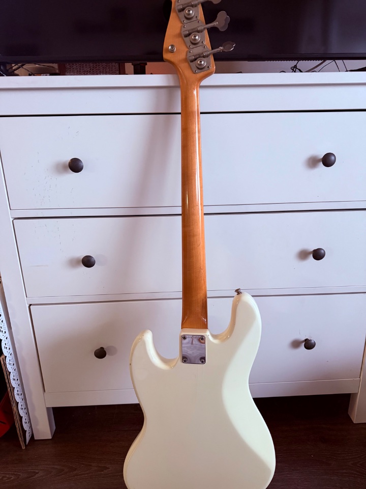 Biete meinen Squier JV Jazzbass aus Platzmangel zum Verkauf an. Er hat altersbedingte Gebrauchsspuren, ist aber technisch top. Die Bespielbarkeit ist super, der Halsstab arbeitet top, klanglich ist er traumhaft. Ich habe alte EMG Pickups einbauen lassen, da ich den Sound brauchte, die originalen habe ich auch, sie sind im Verkauf miteinbegriffen. Das Pickguard ist nicht original, es handelt sich aber um ein Original von Fender, das ich neu gekauft habe. Das originale Pickguard gibt es nicht mehr. Zwei Schrauben haben nicht perfekt gepasst, ich habe davon abgesehen neue Löcher zu Bohren und die Schrauben einfach weggelassen. Die Bridge ist eine original Fender, aber neu.