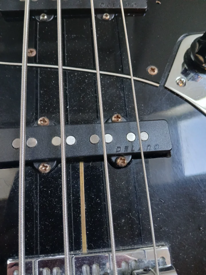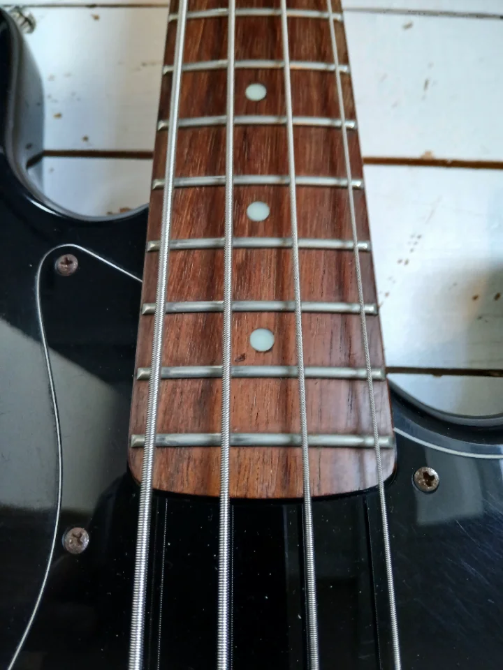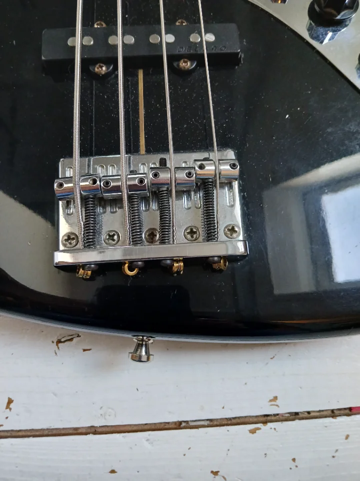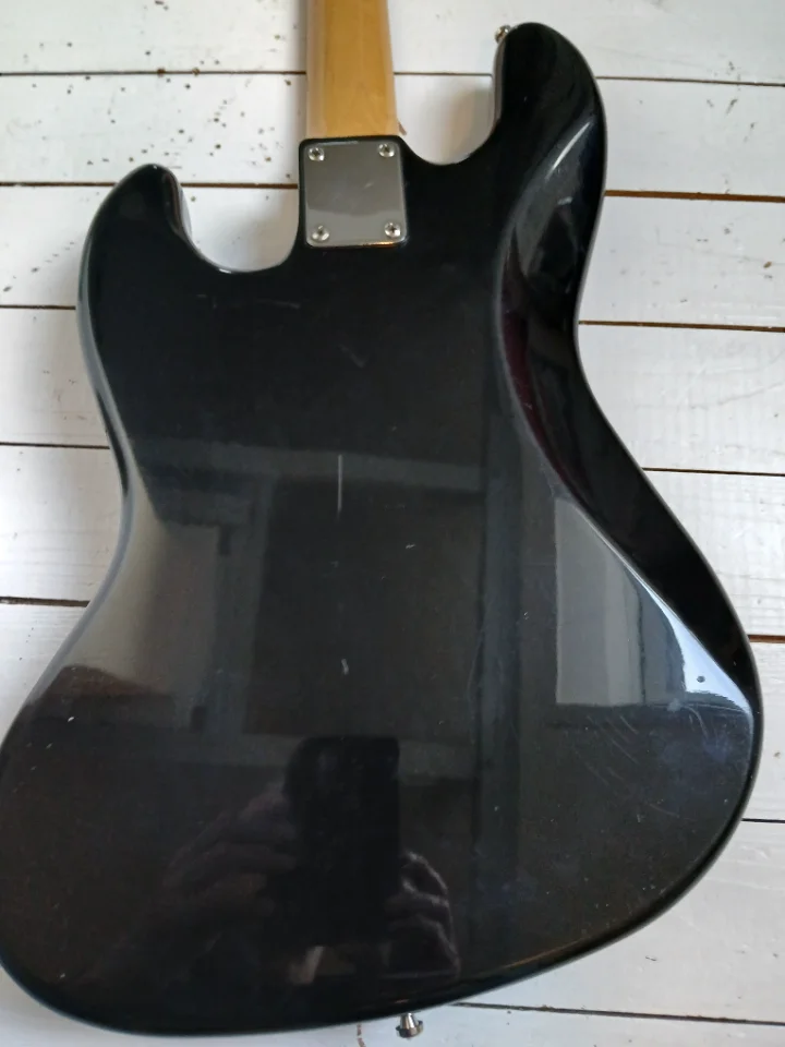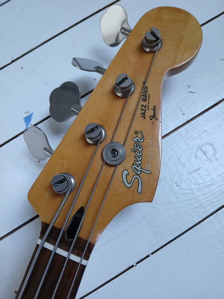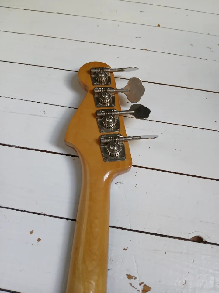 Schöner, der japanischen E-Serie kaum unterlegener JB mit tollen Delano- PU als Upgrade. Relativ helles Rosewood FB. Korpus kein Plywood, nach langer Recherche aus 3-4 Blöcken Erle mit Veneer aus Esche vorne und hinten?! Japan Tuner werksseitig. Baujahr ca. 1989/90. Brücke nicht original, denke ich.
